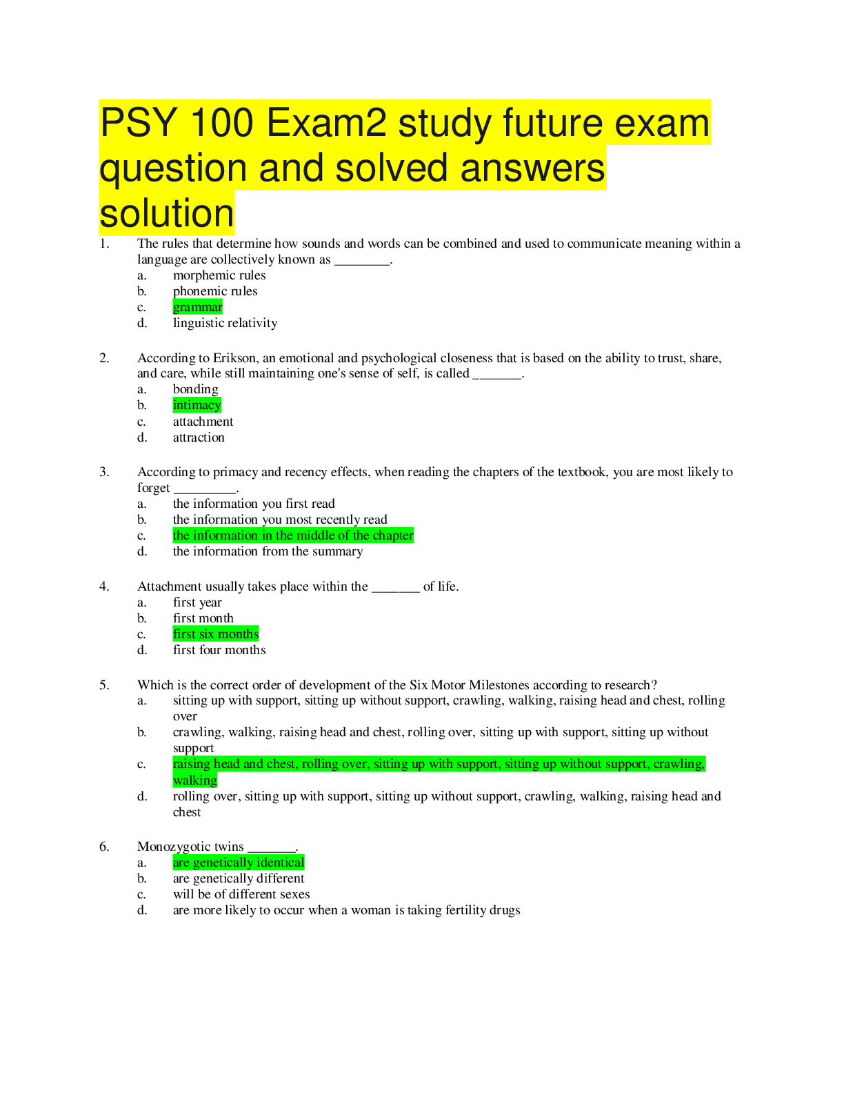 *NURSING > QUESTIONS & ANSWERS > PSY 100 Exam2 study future exam question and solved answers solution (All)