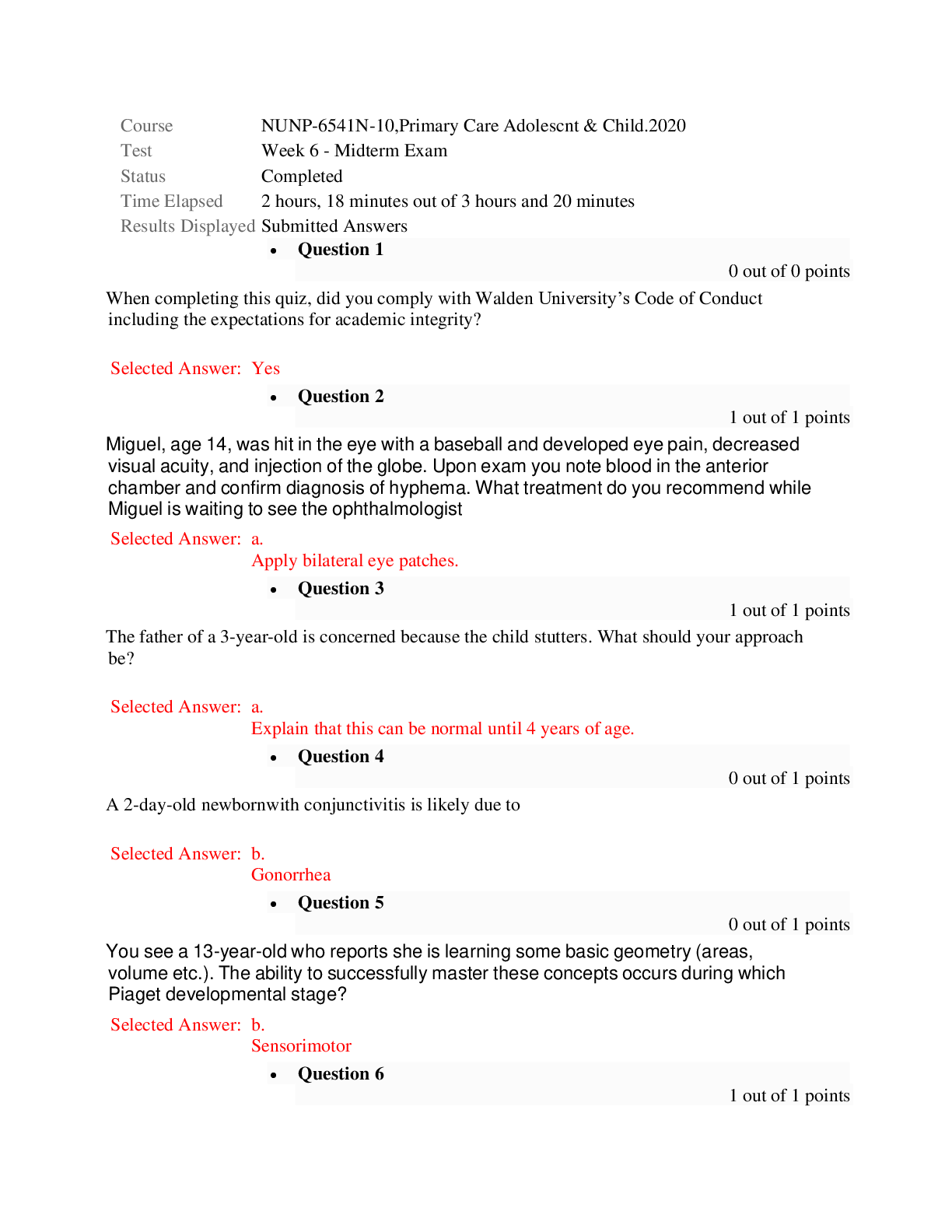 *NURSING > EXAM REVIEW > NUNP-6541N-10 Midterm Exam – Primary Care Adolescent & Child Spring 2020 97 out of 100 points (All)