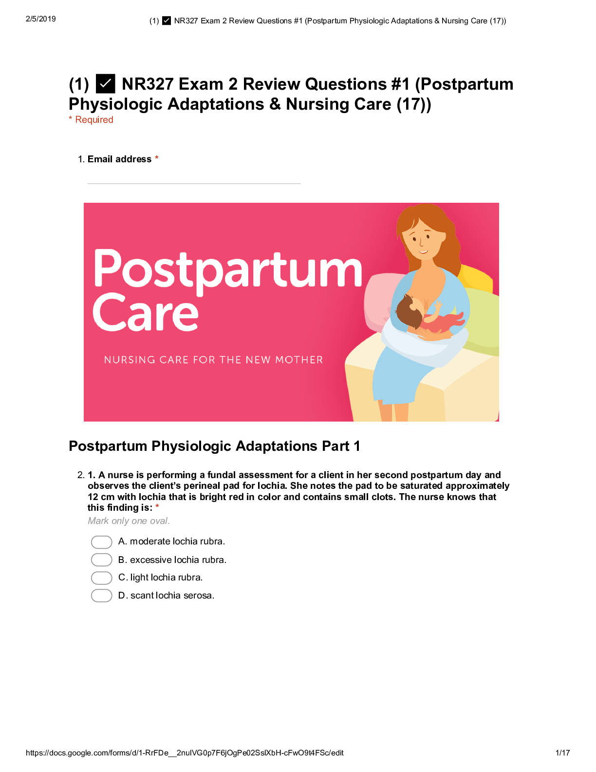 *NURSING > STUDY GUIDE > NR327 Exam 2 Review Questions #1 (Postpartum Physiologic Adaptations & Nursing Care (All)