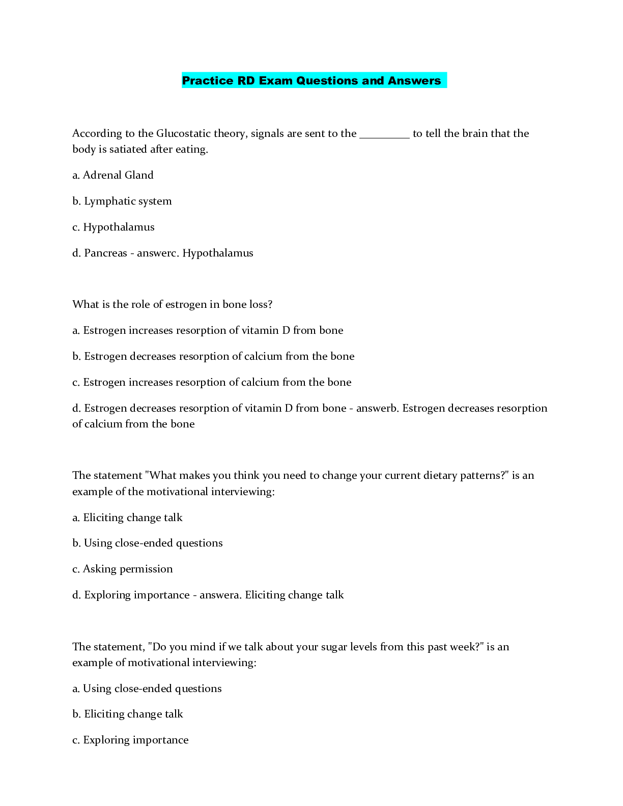 *NURSING > QUESTIONS & ANSWERS > Practice RD Exam Questions and Answers (All)