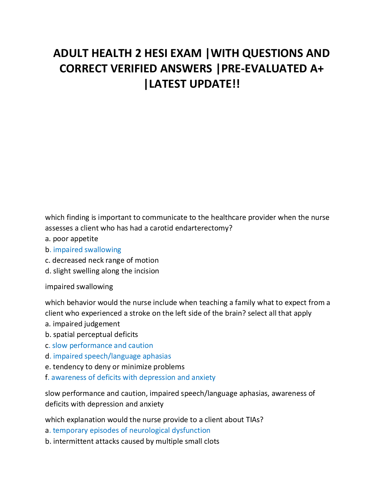 *NURSING > EXAM > ADULT HEALTH 2 HESI EXAM WITH QUESTIONS AND CORRECT VERIFIED ANSWERS PRE-EVALUATED A+ LATEST UPDATE!! (All)