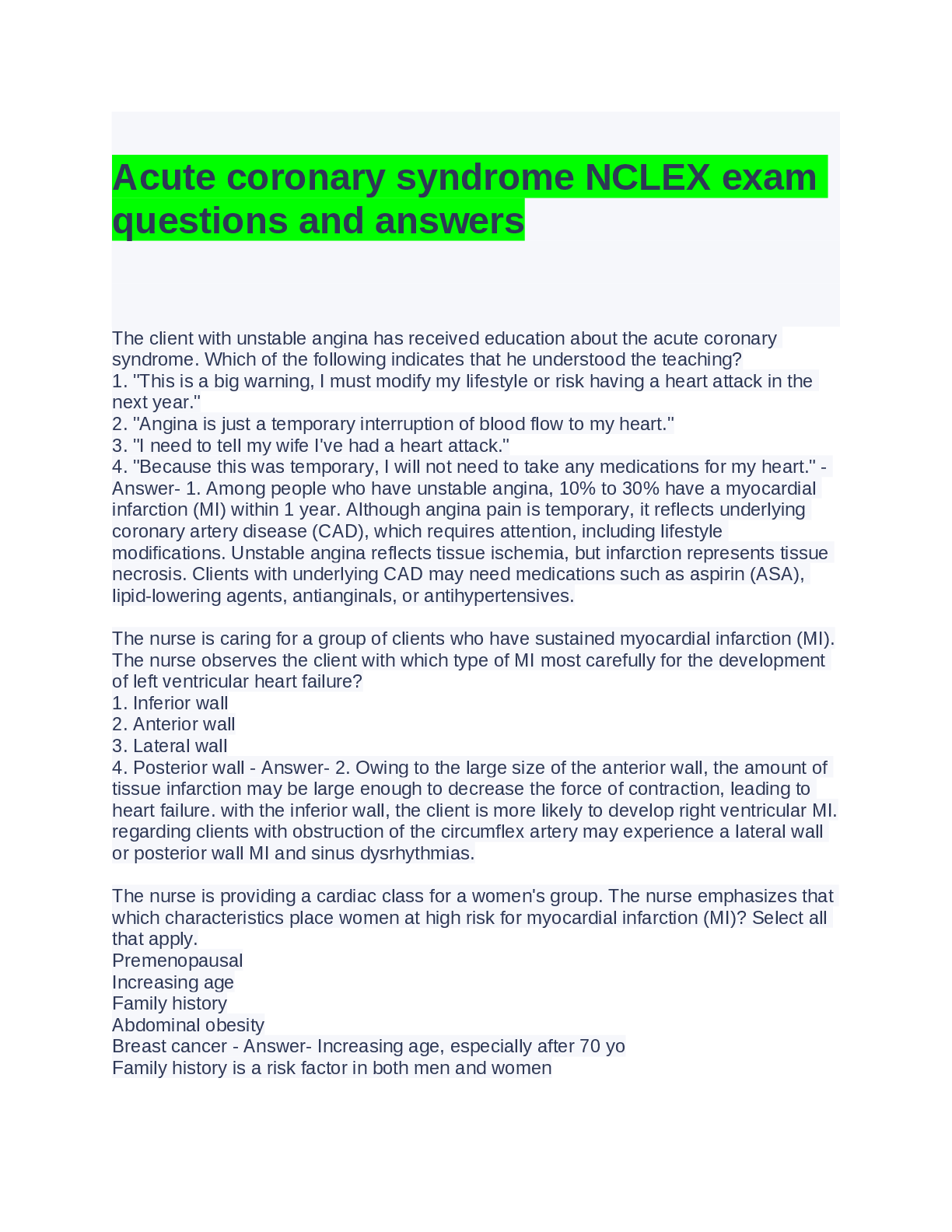 *NURSING > EXAM > Acute coronary syndrome NCLEX exam questions and answers (All)