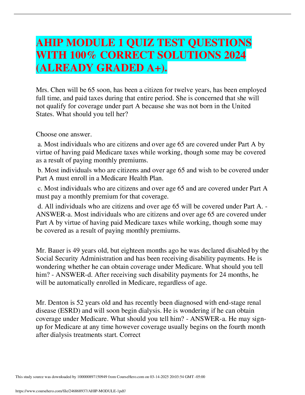 *NURSING > EXAM > AHIP MODULE 1 QUIZ TEST QUESTIONS WITH 100% CORRECT SOLUTIONS 2024 (ALREADY GRADED A+). (All)