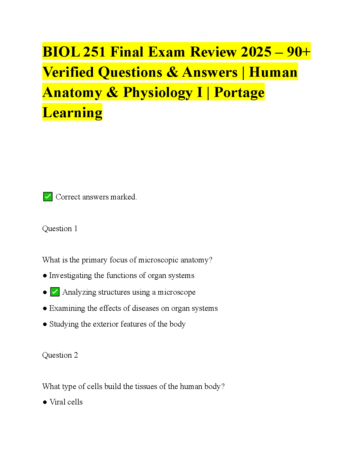 *NURSING > EXAM > BIOL 251 Final Exam Review 2025 – 90+ Verified Questions & Answers | Human Anatomy & Physiology I | Portage Learning (All)