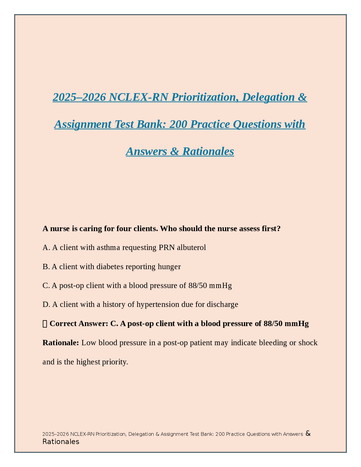 *NURSING > NCLEX-RN > 2025-2026 NCLEX-RN Prioritization, Delegation Assignment Test Bank 200 Practice Questions with Answers Rationales (All)