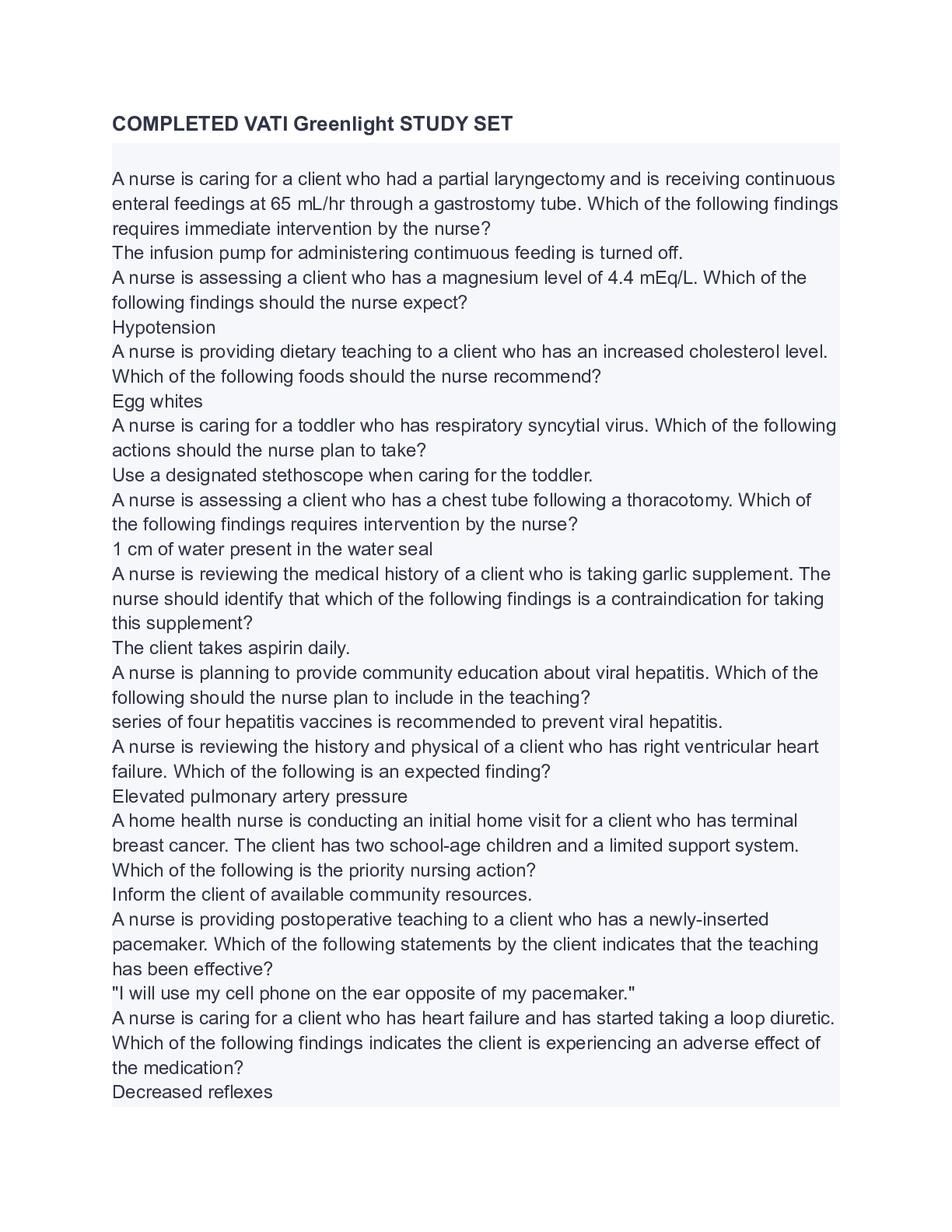 *NURSING > ATI > VATI Greenlight Predictor EXAM (All)
