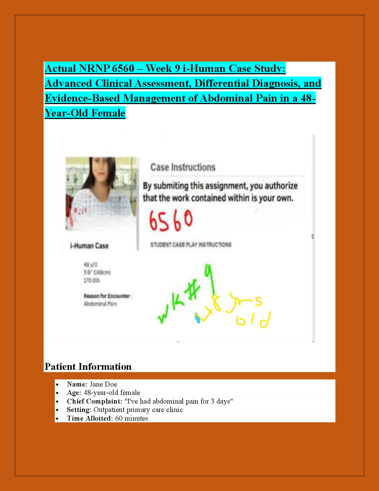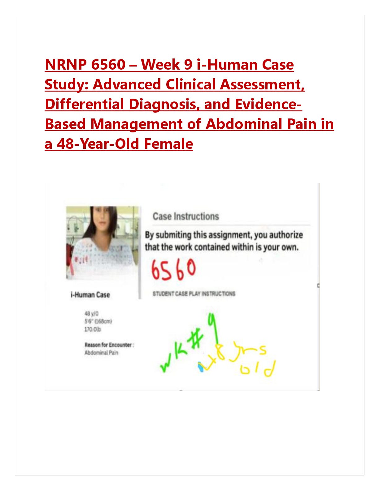 *NURSING > CASE SOLUTIONS > NRNP 6560 – Week 9 i-Human Case Study: Advanced Clinical Assessment, Differential Diagnosis, and EvidenceBased Management of Abdominal Pain in a 48-Year-Old Female (All)