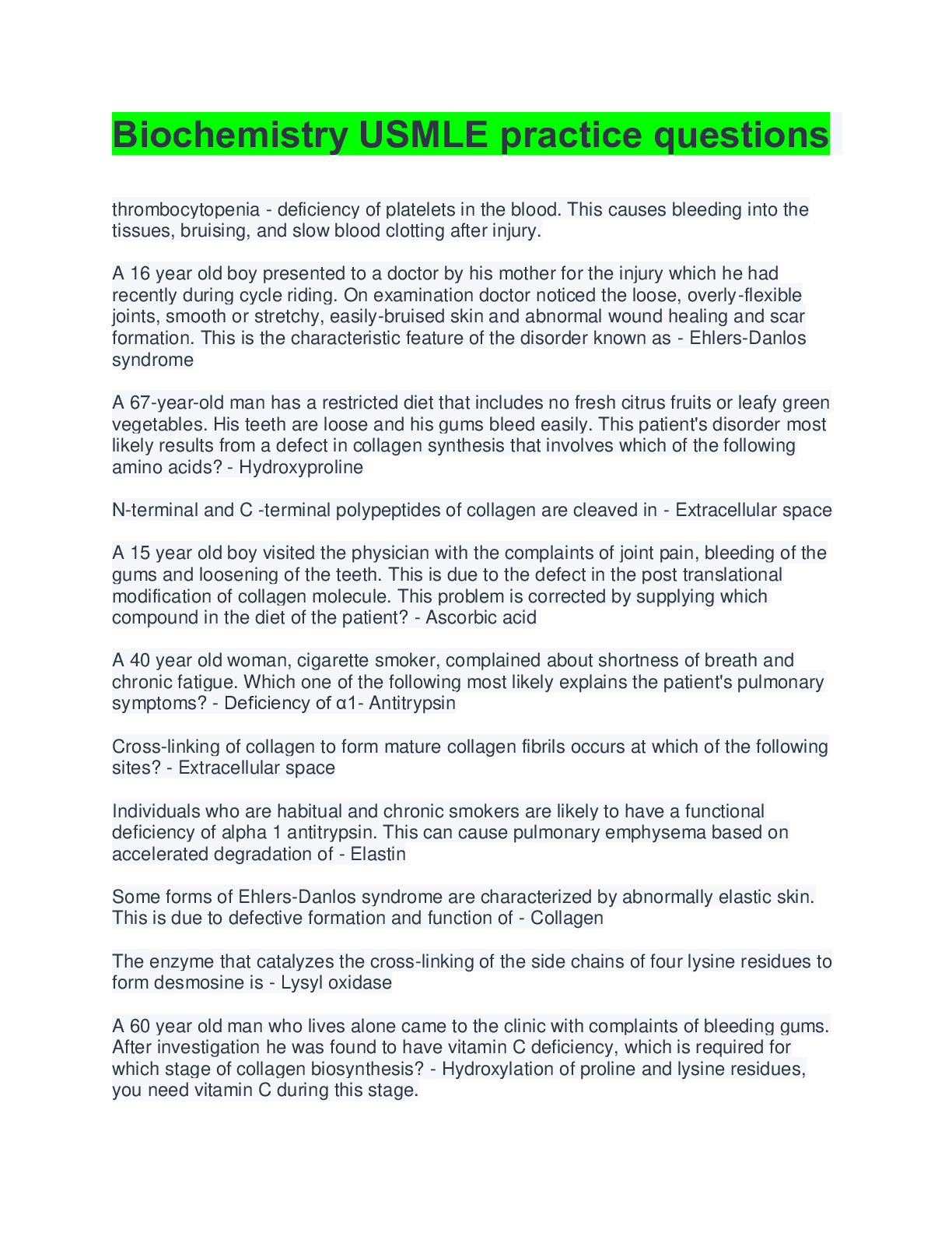 *NURSING > EXAM > Biochemistry USMLE Practice Questions And Answers( Complete Solution /;Rated A+) (All)