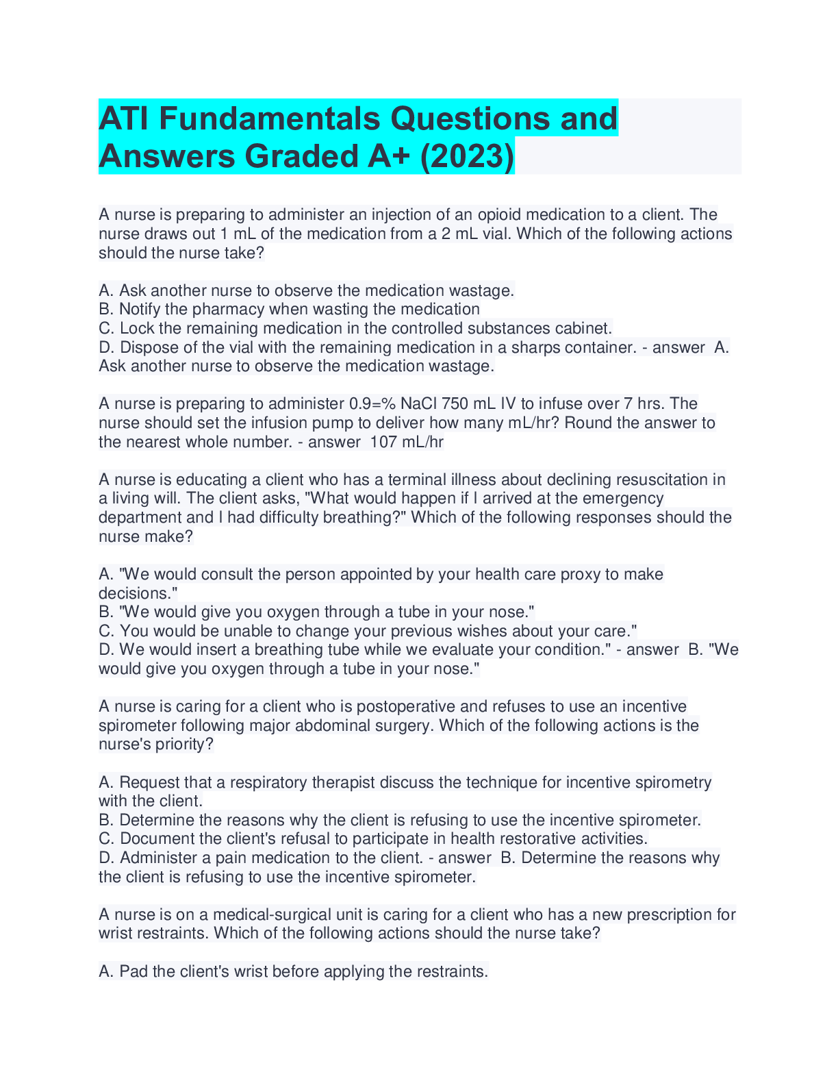 *NURSING > EXAM > ATI Fundamentals Questions and Answers Graded A+ (2023) (All)
