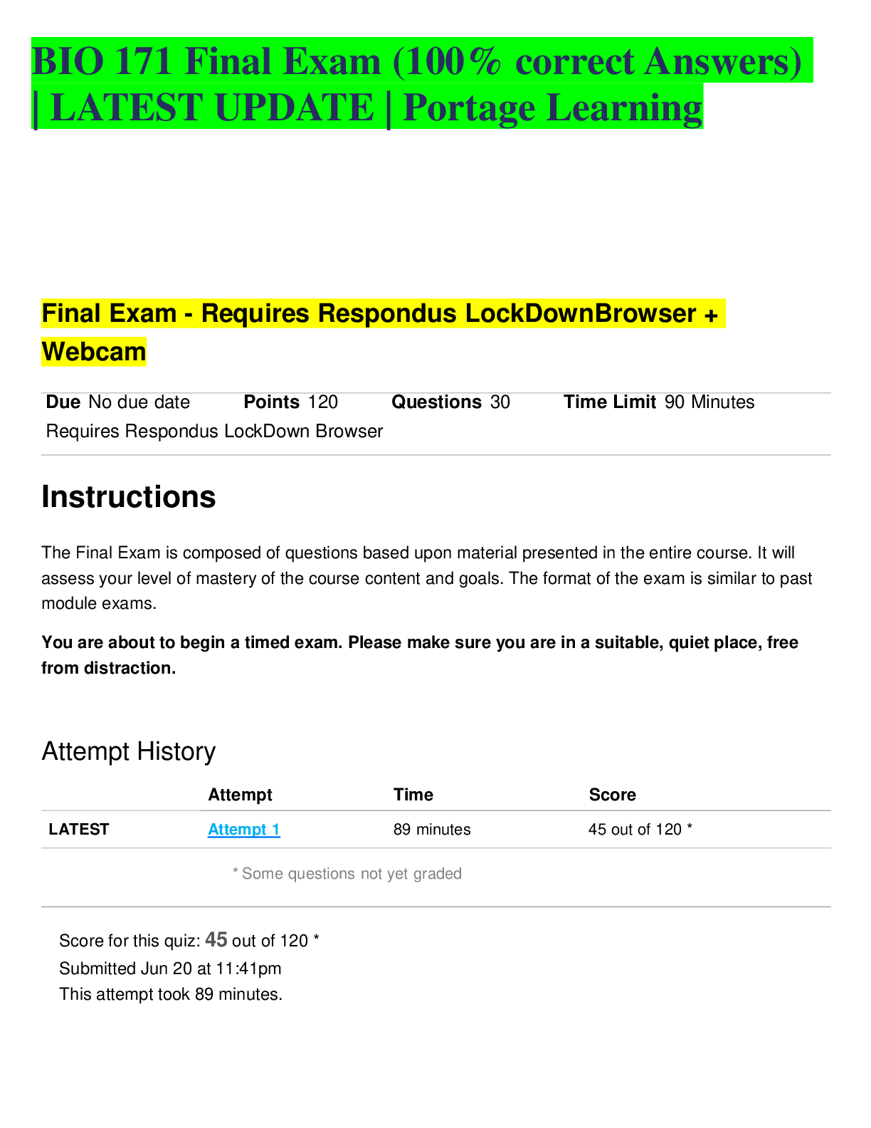 *NURSING > EXAM > BIO 171 Final Exam (100% correct Answers) | LATEST UPDATE | Portage Learning (All)