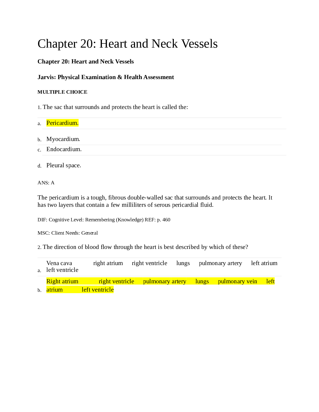 *NURSING > TEST BANKS > PHYSICAL EXAMINATION AND HEALTH ASSESSMENT TESTBANK BY JARVIS:Chapter 20: Heart and Neck Vessels (All)