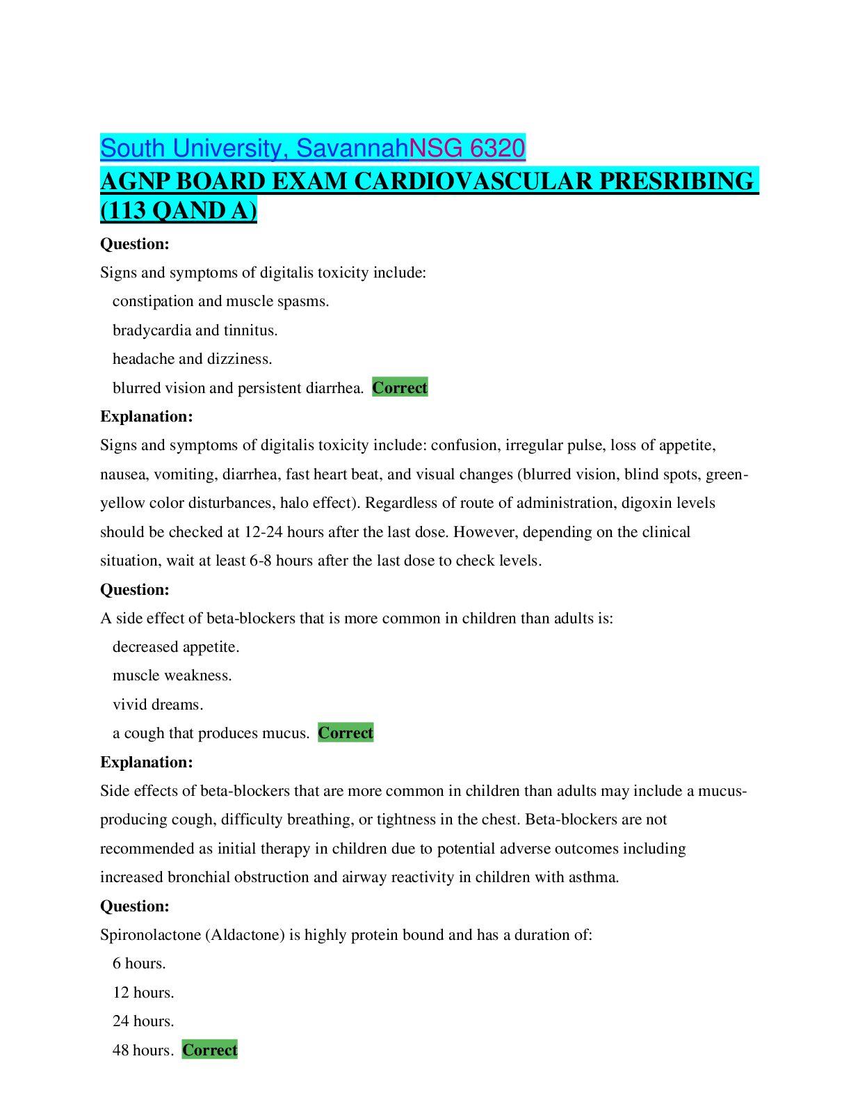 *NURSING > EXAM > AGNP BOARD EXAM CARDIOVASCULAR PRESRIBINGNSG6320 (113 QAND A) (All)