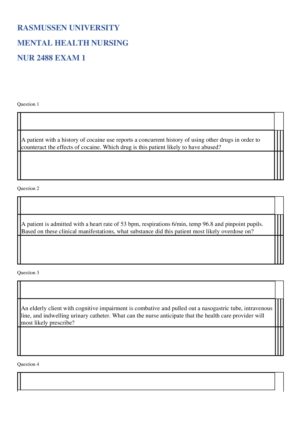 *NURSING > EXAM > RASMUSSEN UNIVERSITY MENTAL HEALTH NURSING NUR 2488 EXAM 1 (All)