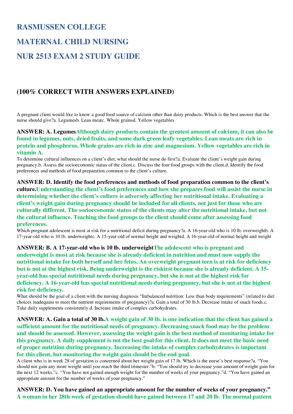 *NURSING > EXAM > RASMUSSEN COLLEGE MATERNAL CHILD NURSING NUR 2513 EXAM 2 STUDY GUIDE (100% CORRECT WITH ANSWERS EXPLAINED) (All)