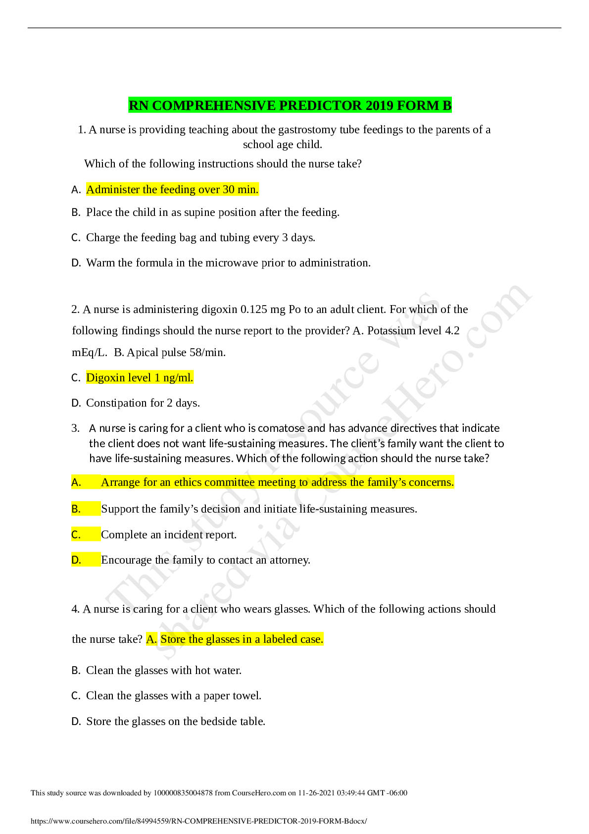 *NURSING > QUESTIONS & ANSWERS > RN COMPREHENSIVE PREDICTOR 2019 FORM (All)