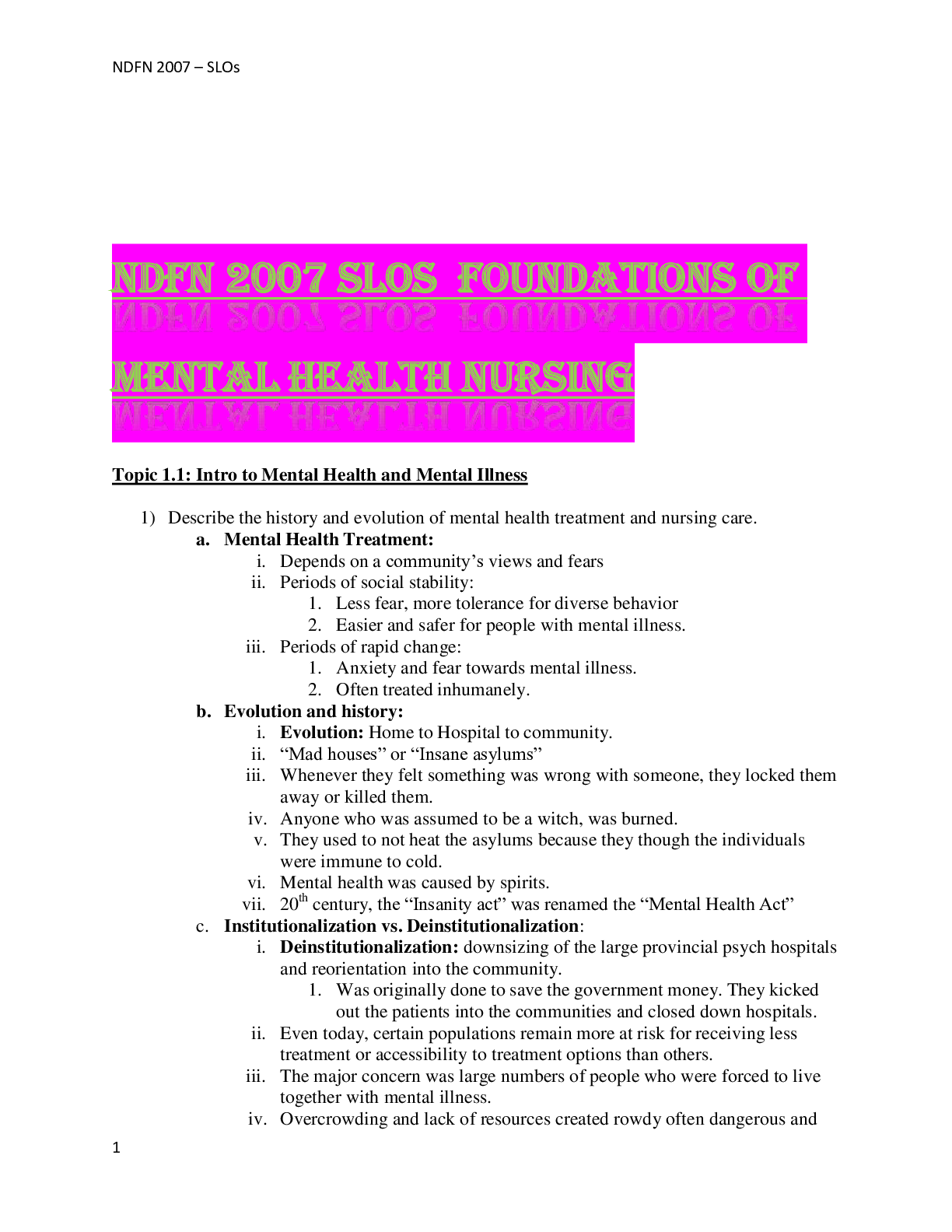 *NURSING > STUDY GUIDE > NDFN 2007 SLOS FOUNDATIONS OF MENTAL HEALTH NURSING (All)