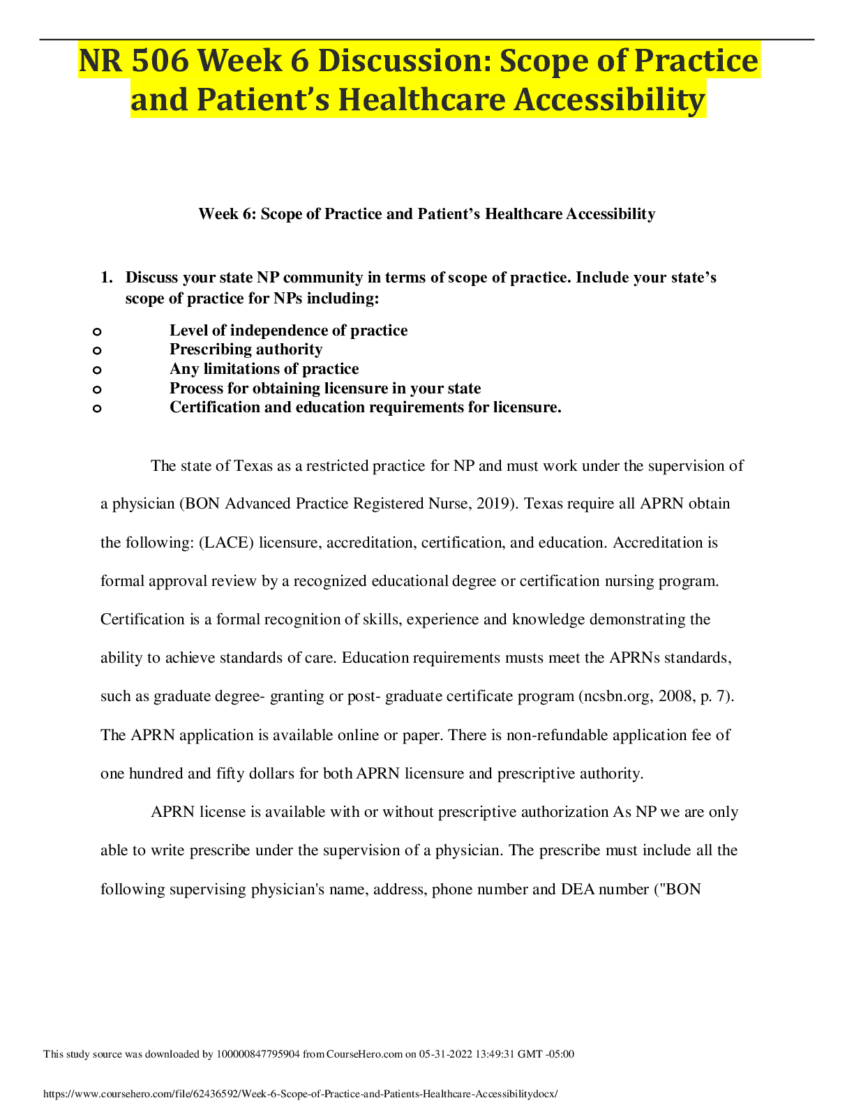 *NURSING > DISCUSSION POST > NR 506 Week 6 Discussion: Scope of Practice and Patient’s Healthcare Accessibility (TOP SCORE) (All)
