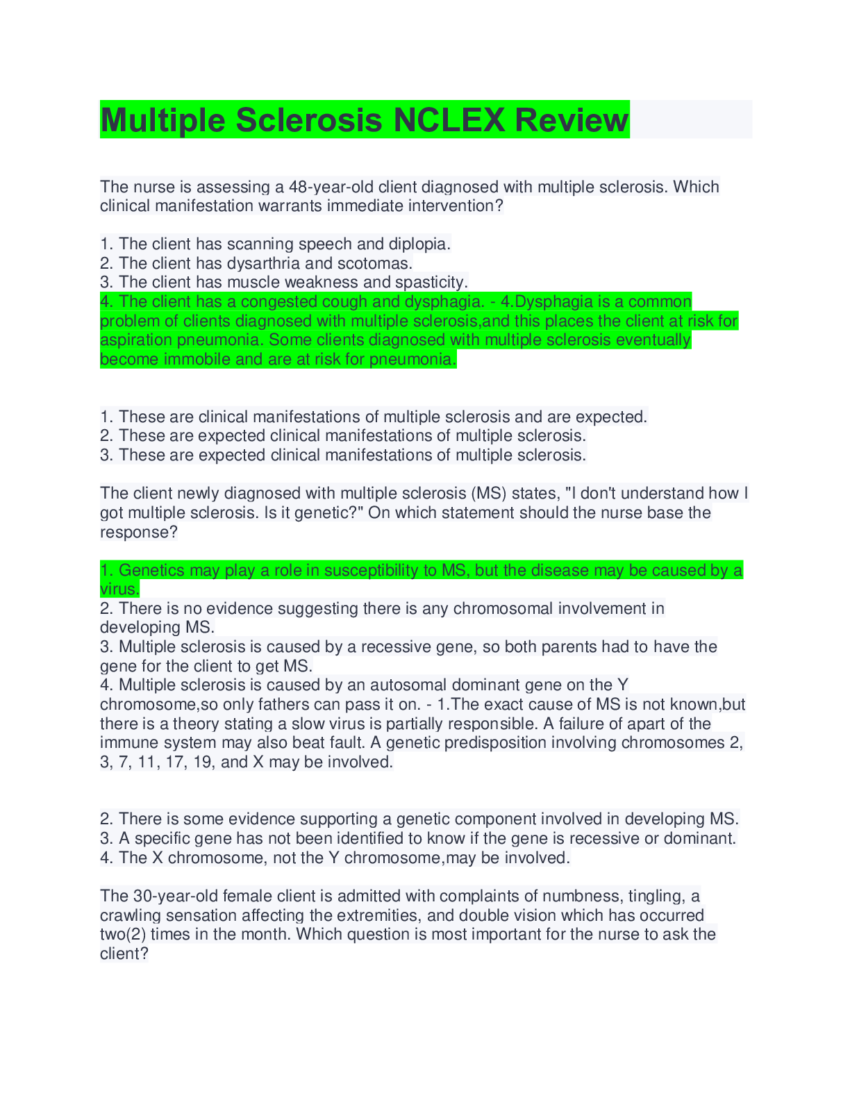 *NURSING > NCLEX > Multiple Sclerosis NCLEX Review Questions And Answers( With Complete Best Solution) (All)
