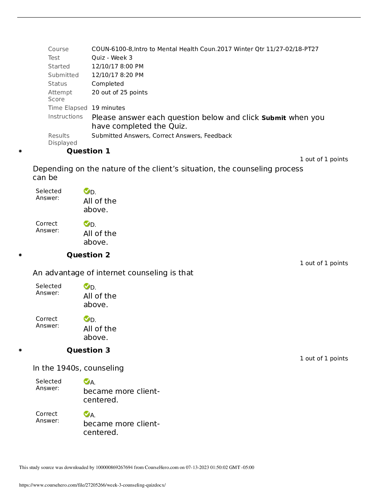 *NURSING > EXAM > COUN 6100 WEEK 1 INTRO TO MENTAL HEALTH COMPLETED QUIZ 2022-2023 (All)