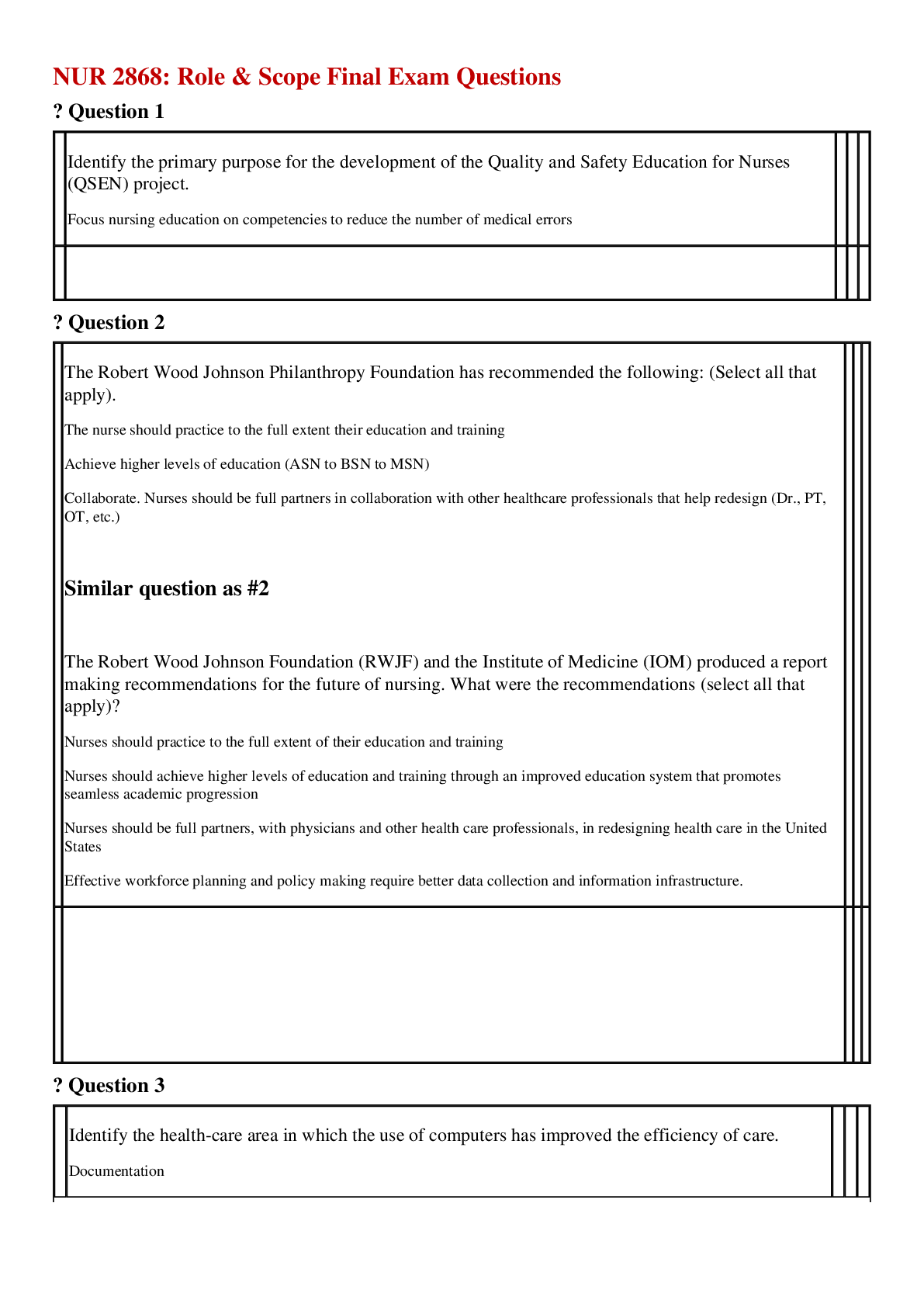 *NURSING > EXAM REVIEW > NUR 2868 / NUR2868: Role & Scope Final Exam Questions (All)