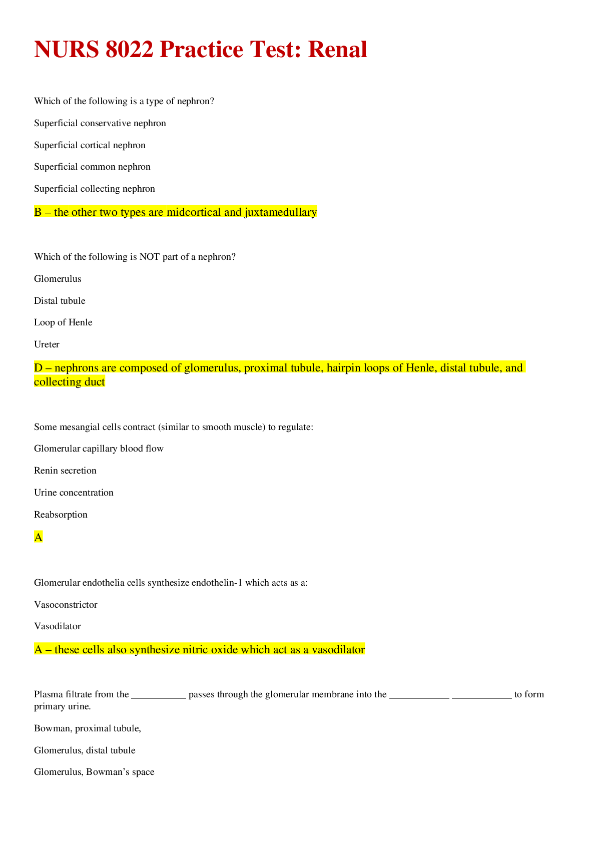 *NURSING > EXAM REVIEW > NURS 8022 / NURS 8022 Practice Test: Renal (All)