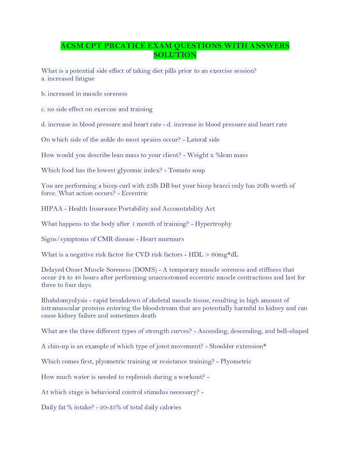 *NURSING > EXAM > ACSM CPT PRCATICE EXAM QUESTIONS WITH ANSWERS SOLUTION (All)