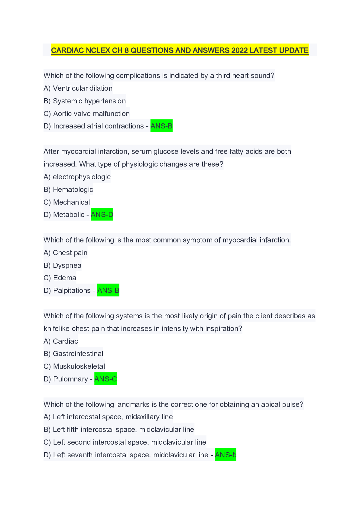 *NURSING > EXAM > CARDIAC NCLEX CH 8 QUESTIONS AND ANSWERS 2022 LATEST UPDATE (All)