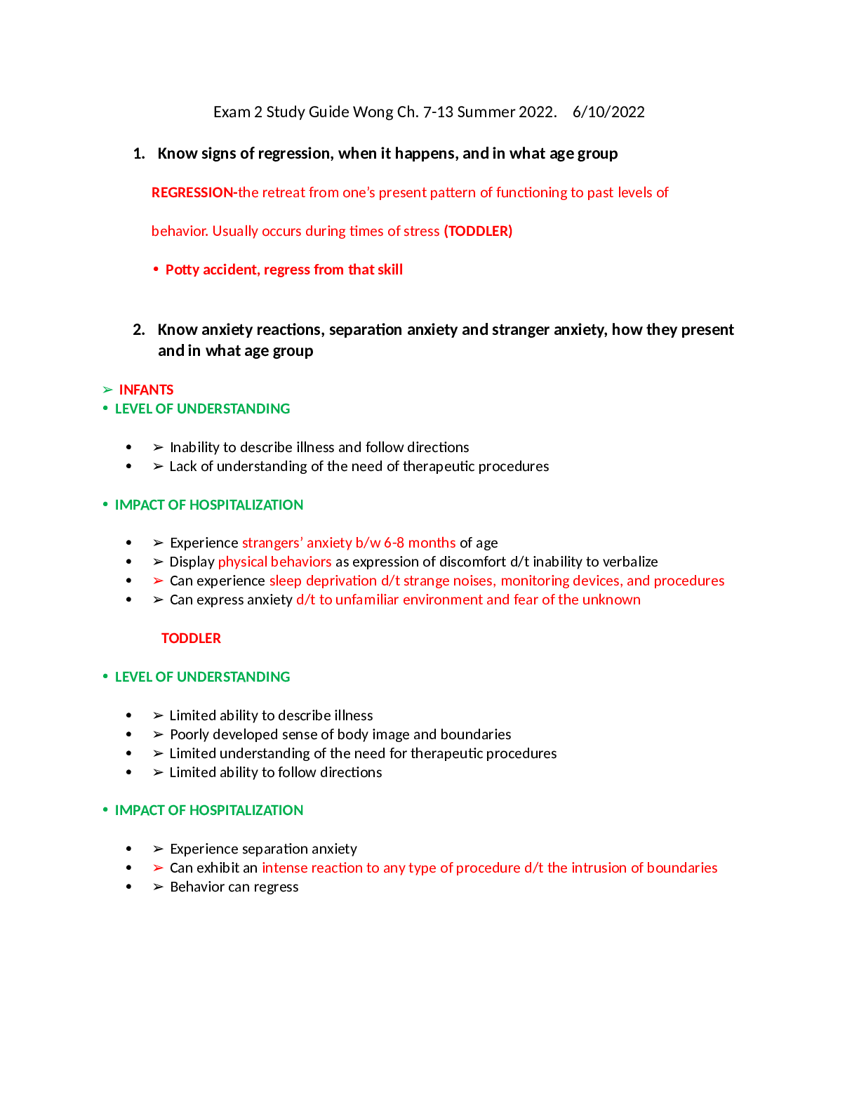 *NURSING > EXAM > Exam 2 Study Guide Wong Ch. 7-13 Summer 2022. 6/10/2022 (All)