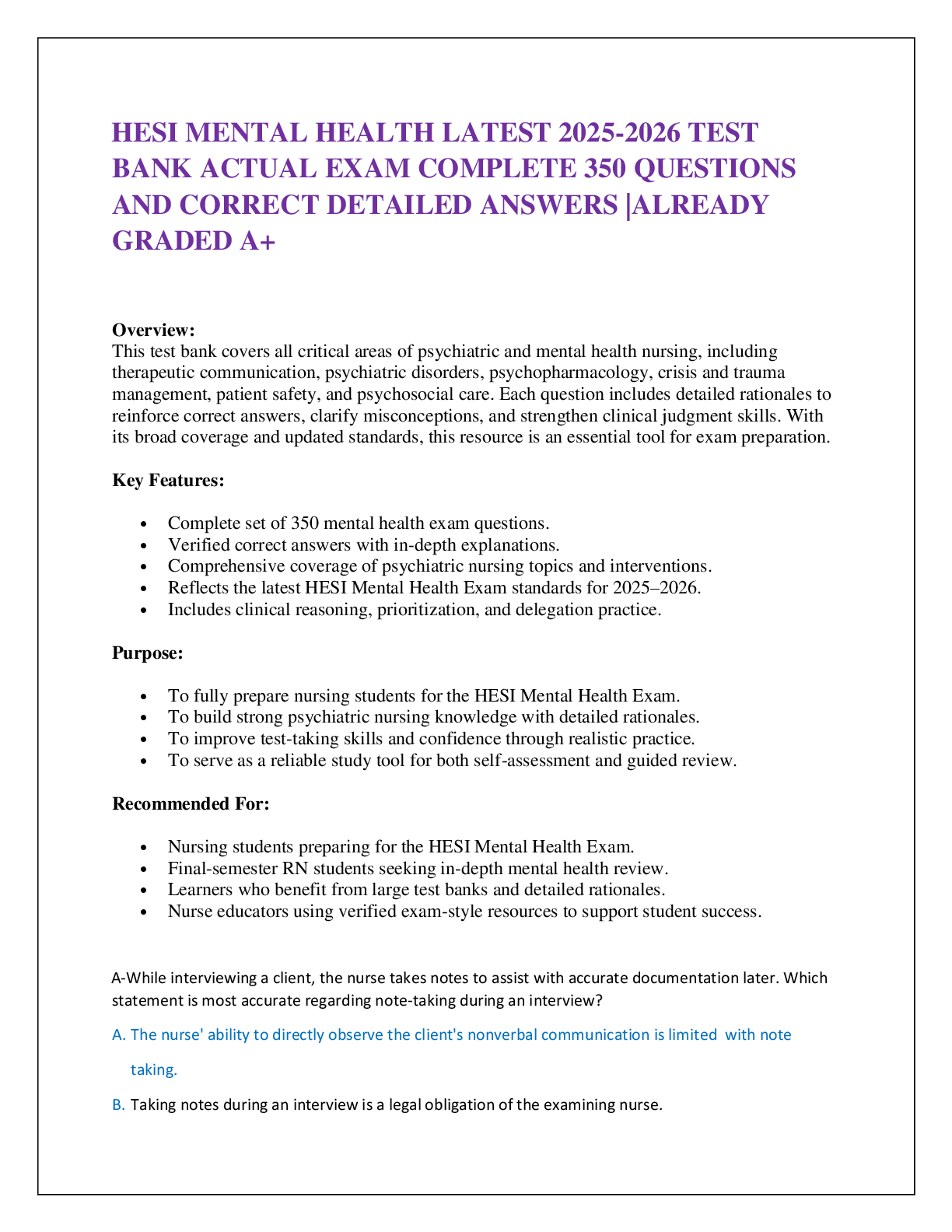 *NURSING > EXAM > HESI MENTAL HEALTH LATEST 2025-2026 TEST BANK ACTUAL EXAM COMPLETE 350 QUESTIONS AND CORRECT DETAILED ANSWERS |ALREADY GRADED A+ (All)