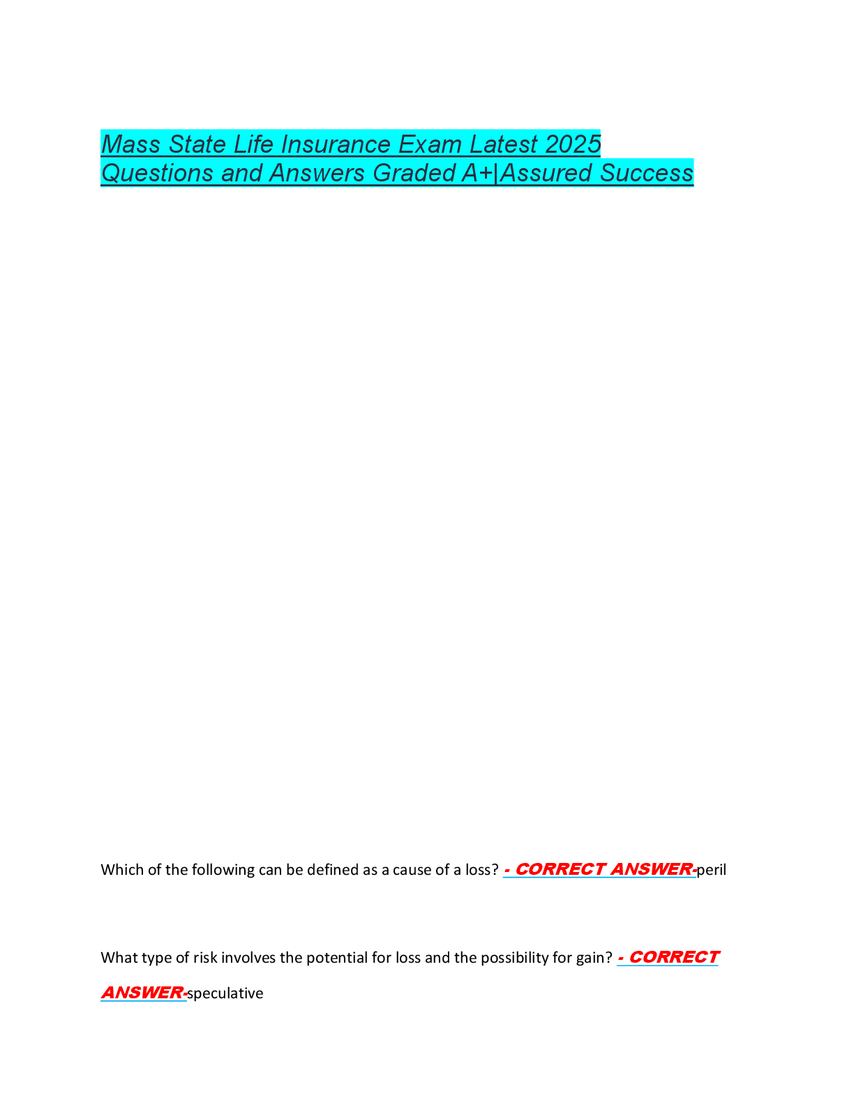 *NURSING > EXAM > Mass State Life Insurance Exam Latest 2025 Questions and Answers Graded A+|Assured Success (All)