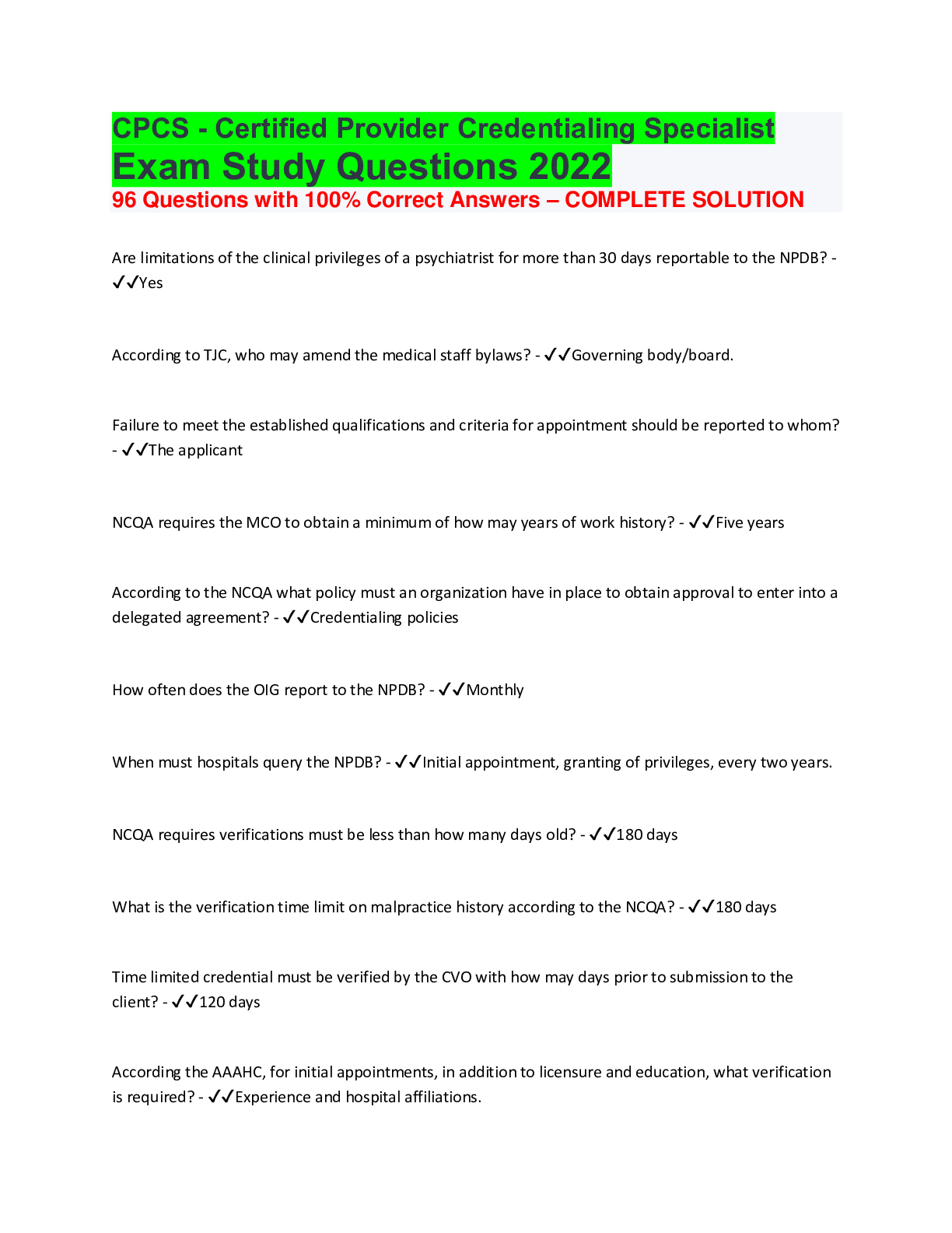 *NURSING > QUESTIONS & ANSWERS > CPCS Certified Provider Credentialing Specialist Exam Study Questions. 96 Questions with 100% Correct Answers – COMPLETE SOLUTION (All)