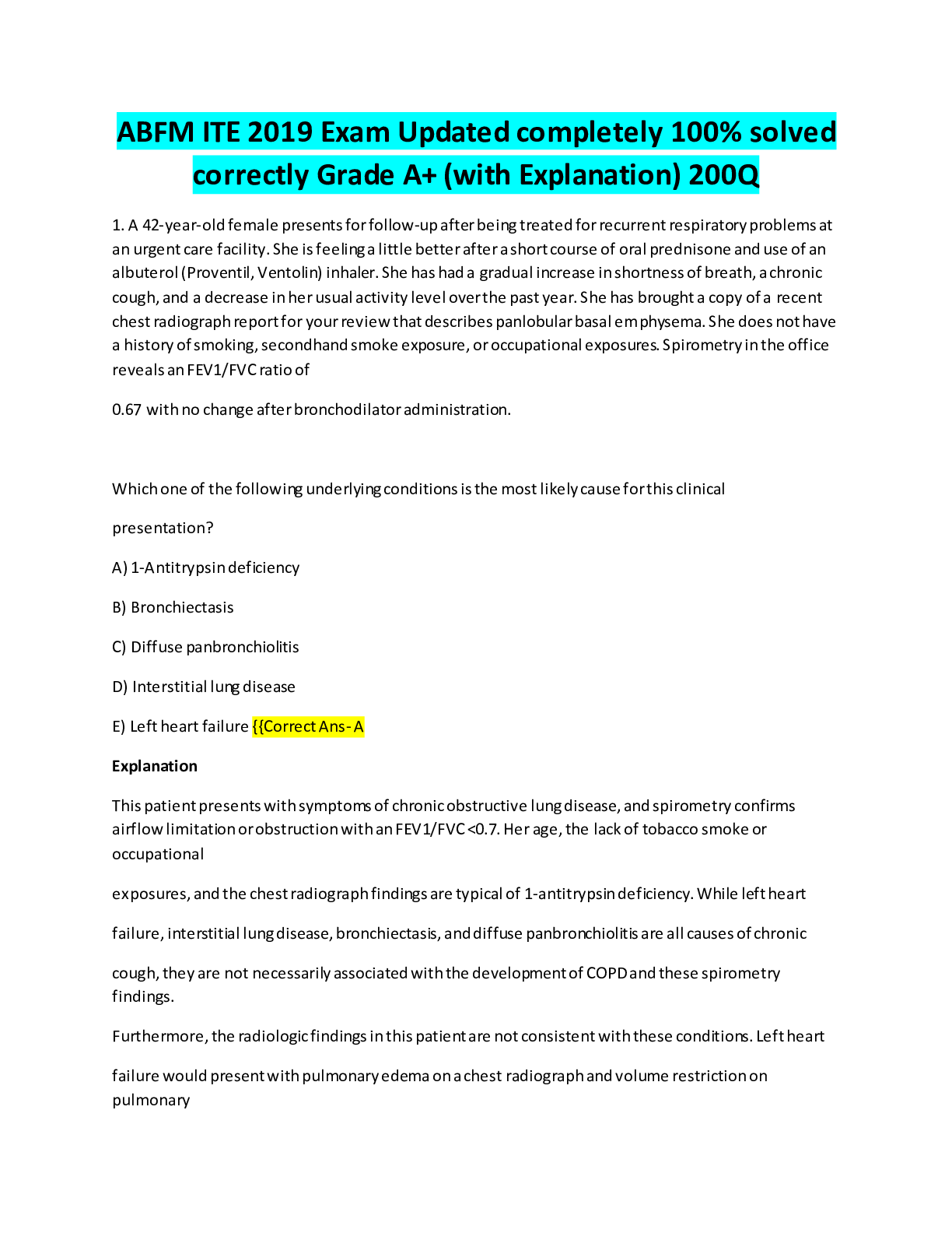 *NURSING > EXAM > ABFM ITE 2019 Exam Updated completely 100% solved correctly Grade A+ (with Explanation) 200Q (All)