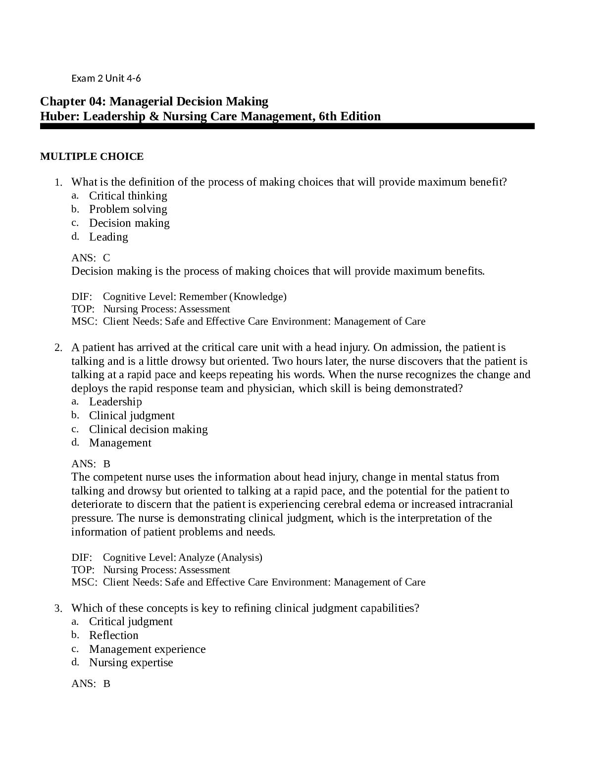 *NURSING > TEST BANKS > TEST BANK for Huber: Leadership & Nursing Care Management 6th Edition. ALL 27 CHAPTERS contained. Questions, Answers and Rationale. 249 Pages. (All)