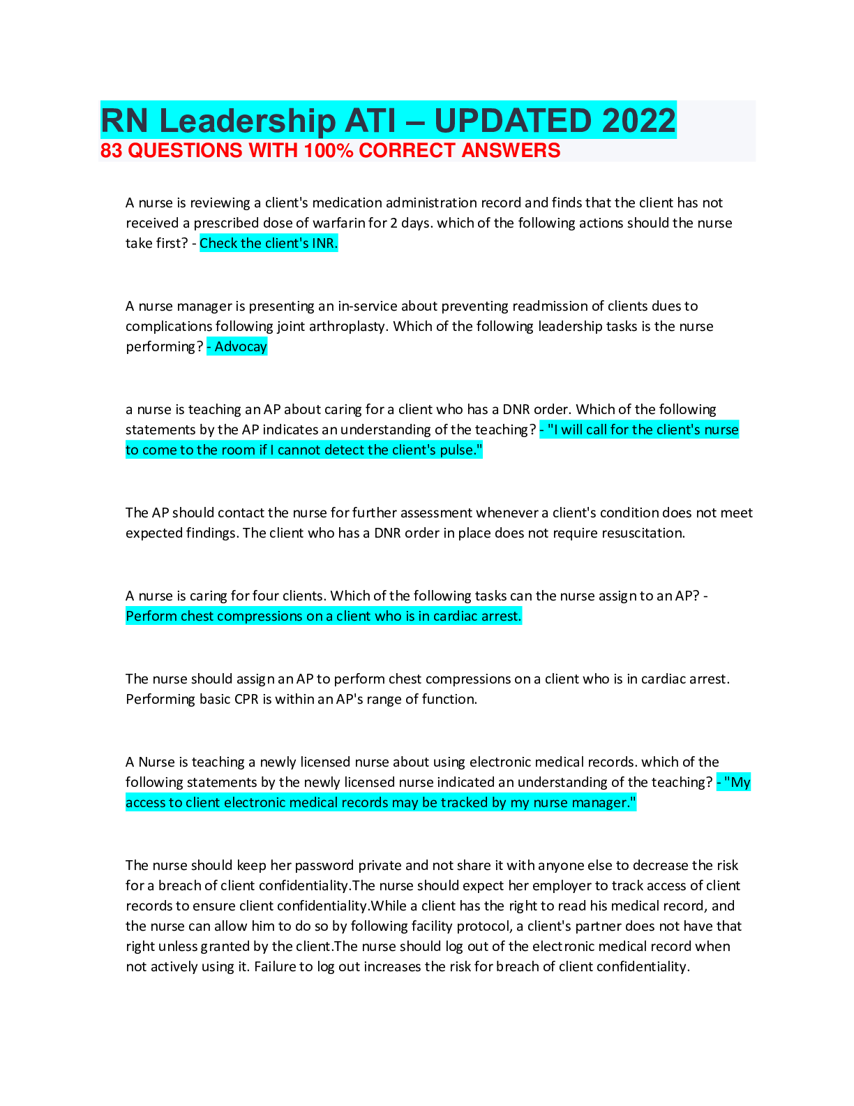 *NURSING > ATI > RN Leadership ATI – UPDATED 2022 83 QUESTIONS WITH 100% CORRECT ANSWERS (All)