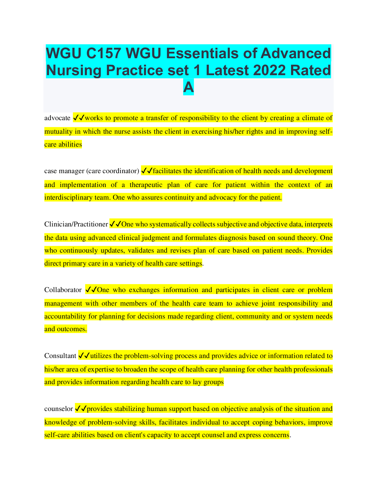 *NURSING > QUESTIONS & ANSWERS > WGU C157 WGU Essentials of Advanced Nursing Practice set 1 Latest 2022 Rated A (All)