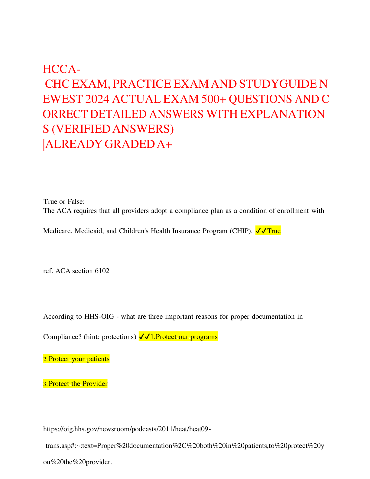 *NURSING > EXAMs > HCCA CHC EXAM PRACTICE EXAM AND STUDY GUIDE NEWEST 2024 ACTUAL EXAM 500+ QUESTIONS AND CORRECT DETAILED ANSWERS WITH EXPLANATIONS (VERIFIED ANSWERS) ALREADY GRADED A+ (All)