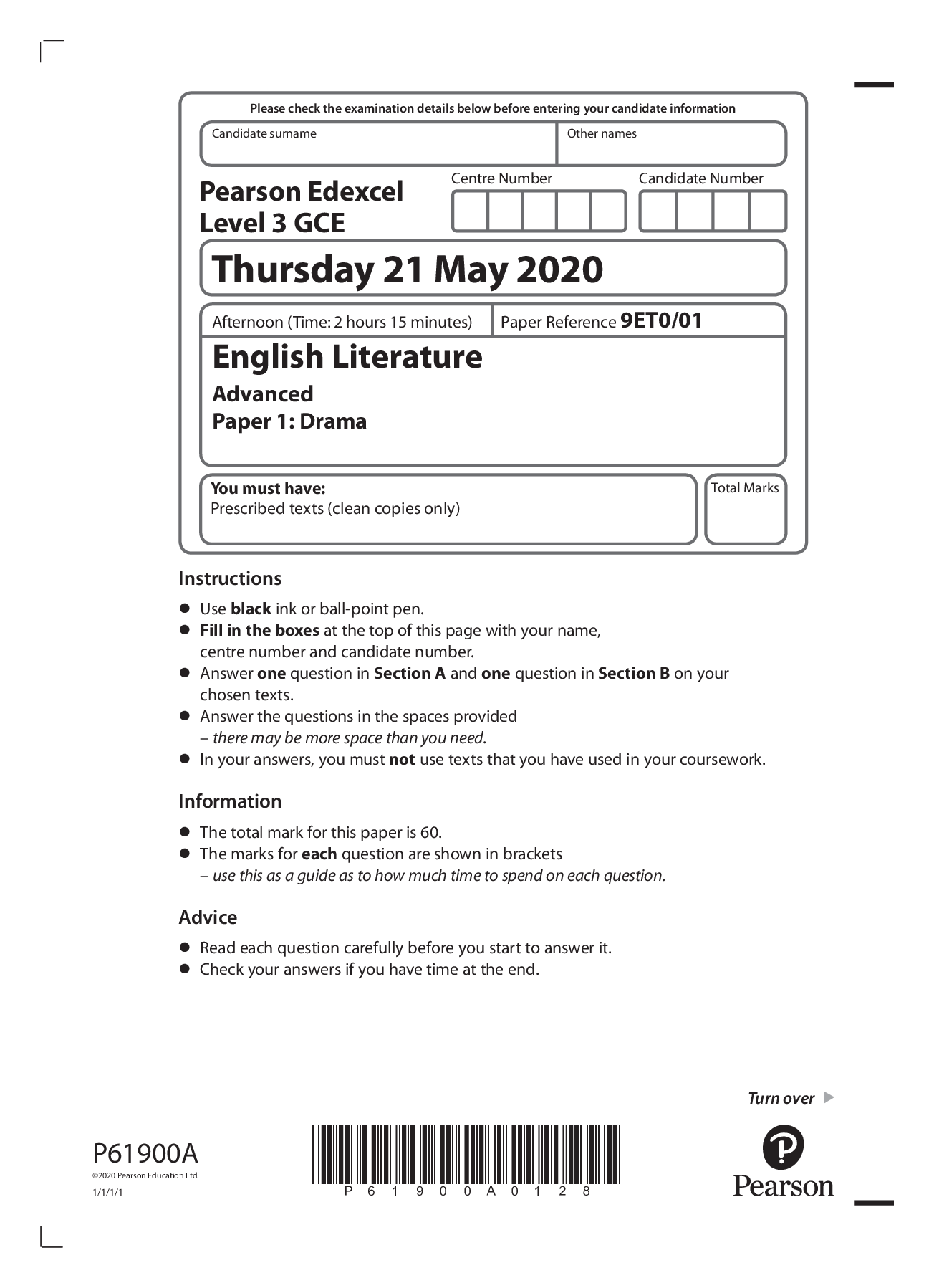 Pearson Edexcel_English Literature_9ET0/01 Question Paper Mark Scheme_2020 | Paper 1: Drama Pearson Edexcel_English Literature_9ET0/02 Question Paper Mark Scheme_2020 | Paper 2: Prose Pearson Edexce...