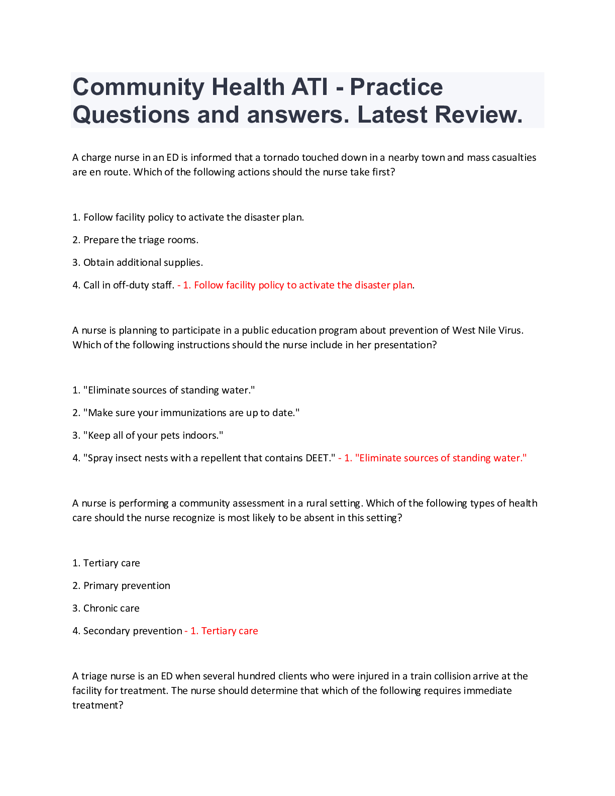 Community Health ATI - Practice Questions and answers. Latest Review Community Exam 1 2021 (ATI + slides). Elaborative questions and answers Community ATI part 2 retake. Questions and answers. 2...