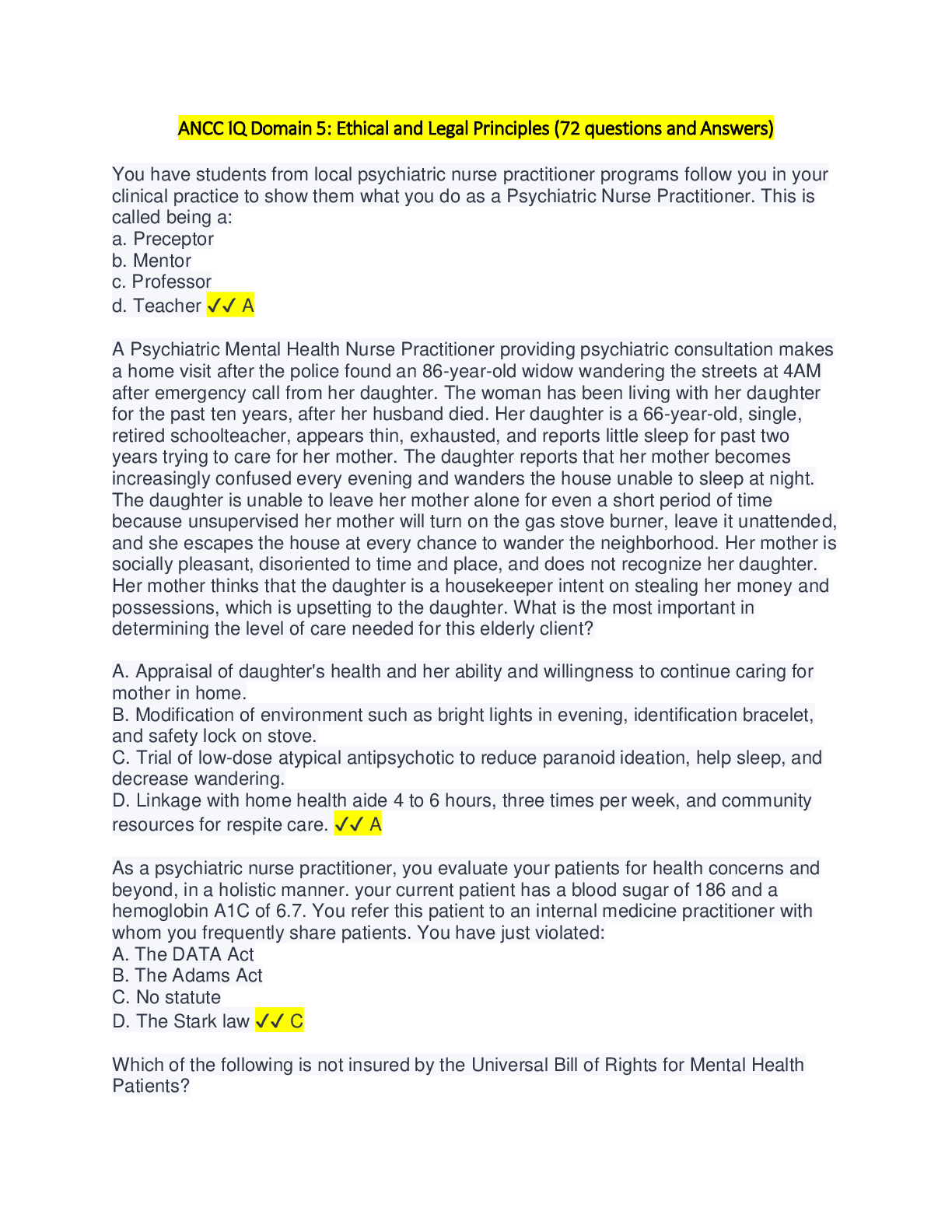 ANCC IQ Domain 5: Ethical and Legal Principles (72 questions and Answers) ANCC IQ Domain 4: Psychotherapy and Related Theories (30 questions & Answers) latest updated, Graded A+ ANCC IQ Domain 3...