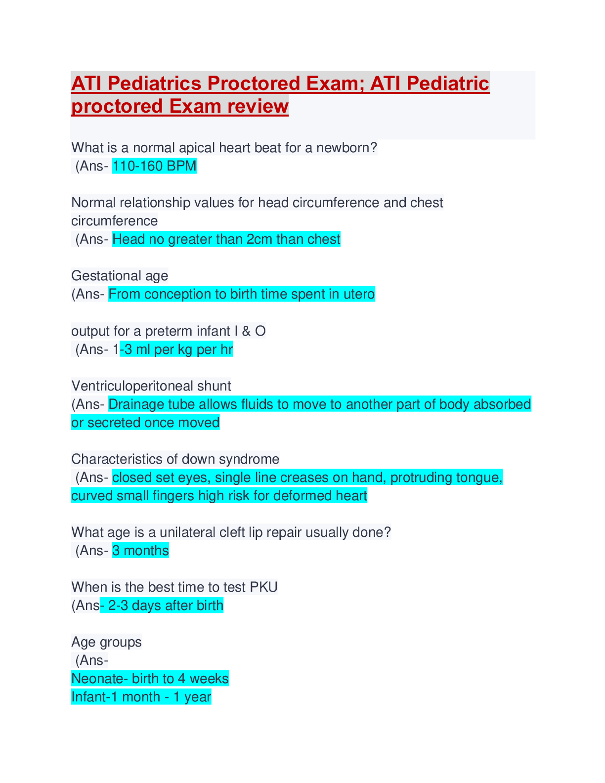 ATI Pediatric Proctored Exam 2019:ATI Pediatrics Proctored Exam; ATI Pediatric proctored Exam review;ATI PEDS 2019 A: ATI PEDS 2019 B:ATI Pediatric Proctored Exam:ATI Pediatrics Final (Nursing Pediatr...