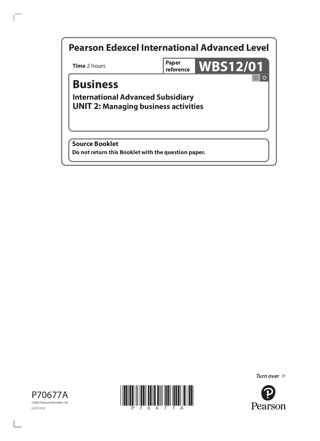 Pearson Edexcel International Advanced Level Business International Advanced Subsidiary UNIT 2: Managing business activities QUESTION PAPER 2022 Pearson Edexcel International Advanced Subsidiary In...
