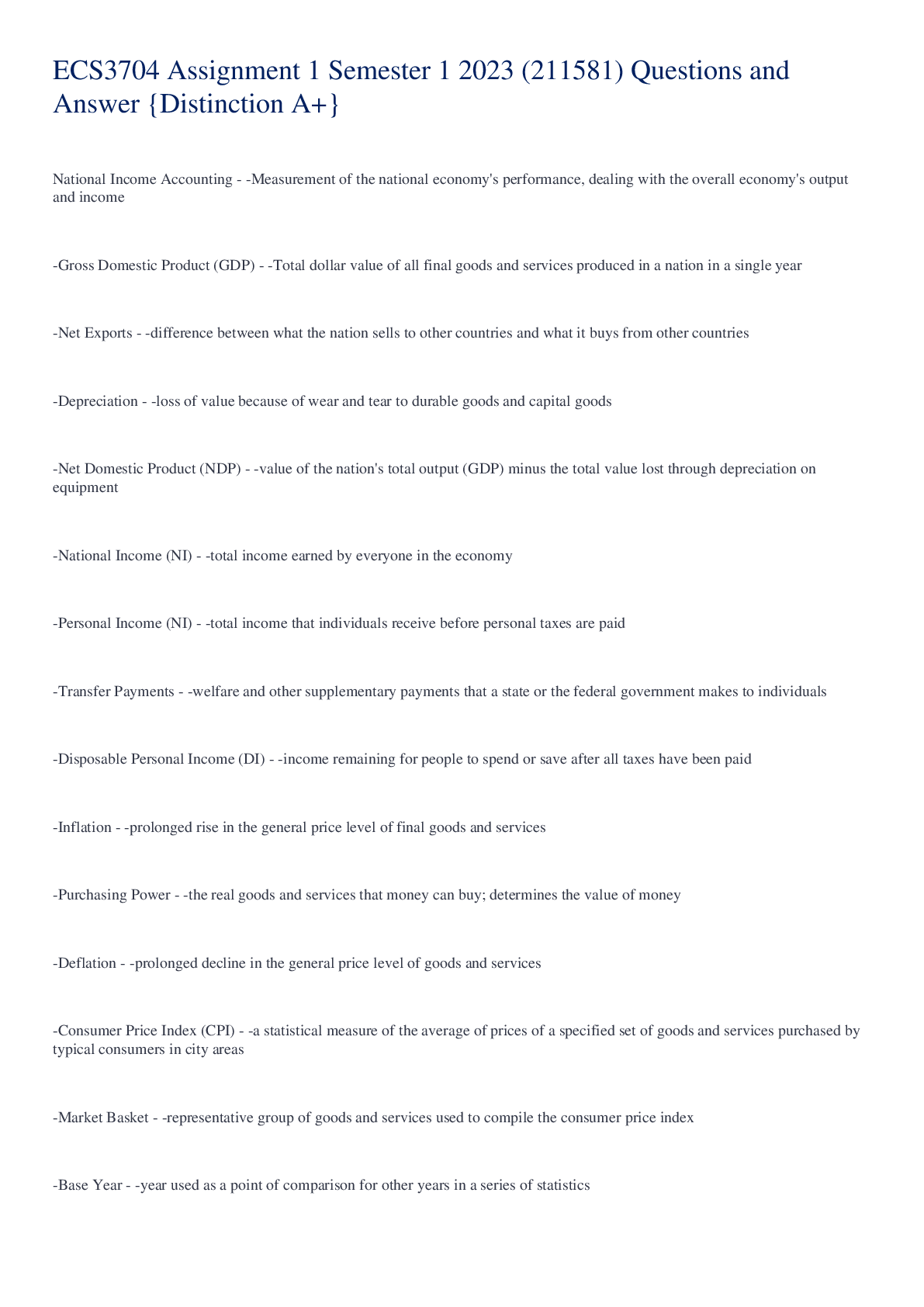 National Income Accounting - -Measurement of the national economy's performance, dealing with the overall economy's output and income -Gross Domestic Product (GDP) - -Total dollar value of all fina...
