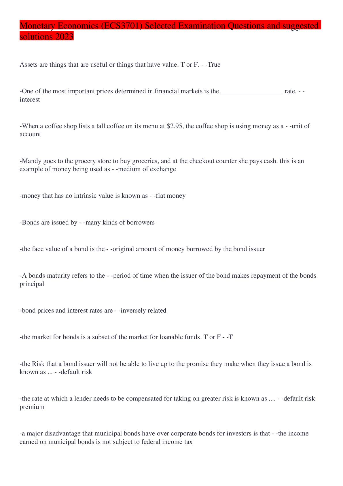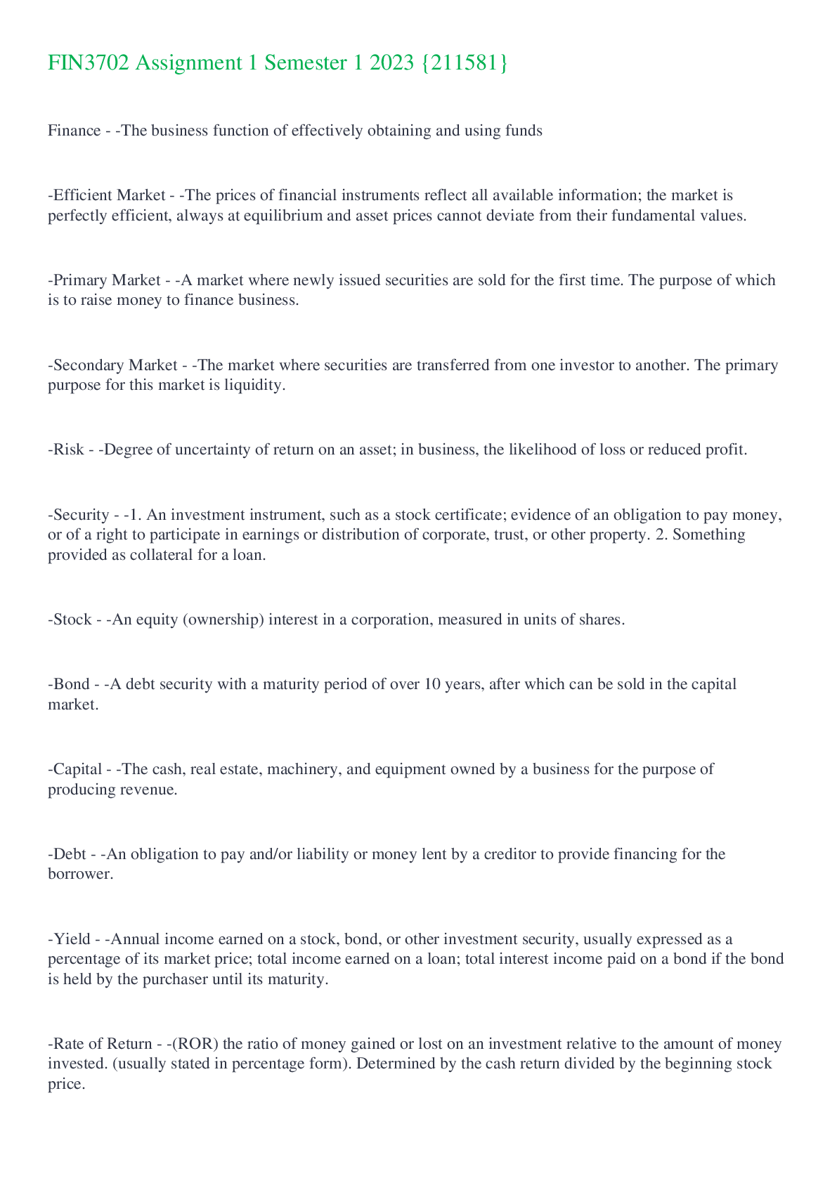 FIN3702 Assignment 1 Semester 1 2023 (Questions and Answer) {Distinction} -Investment Management - -the treasury staff is responsible for the proper investment of excess funds. The maximum return on...