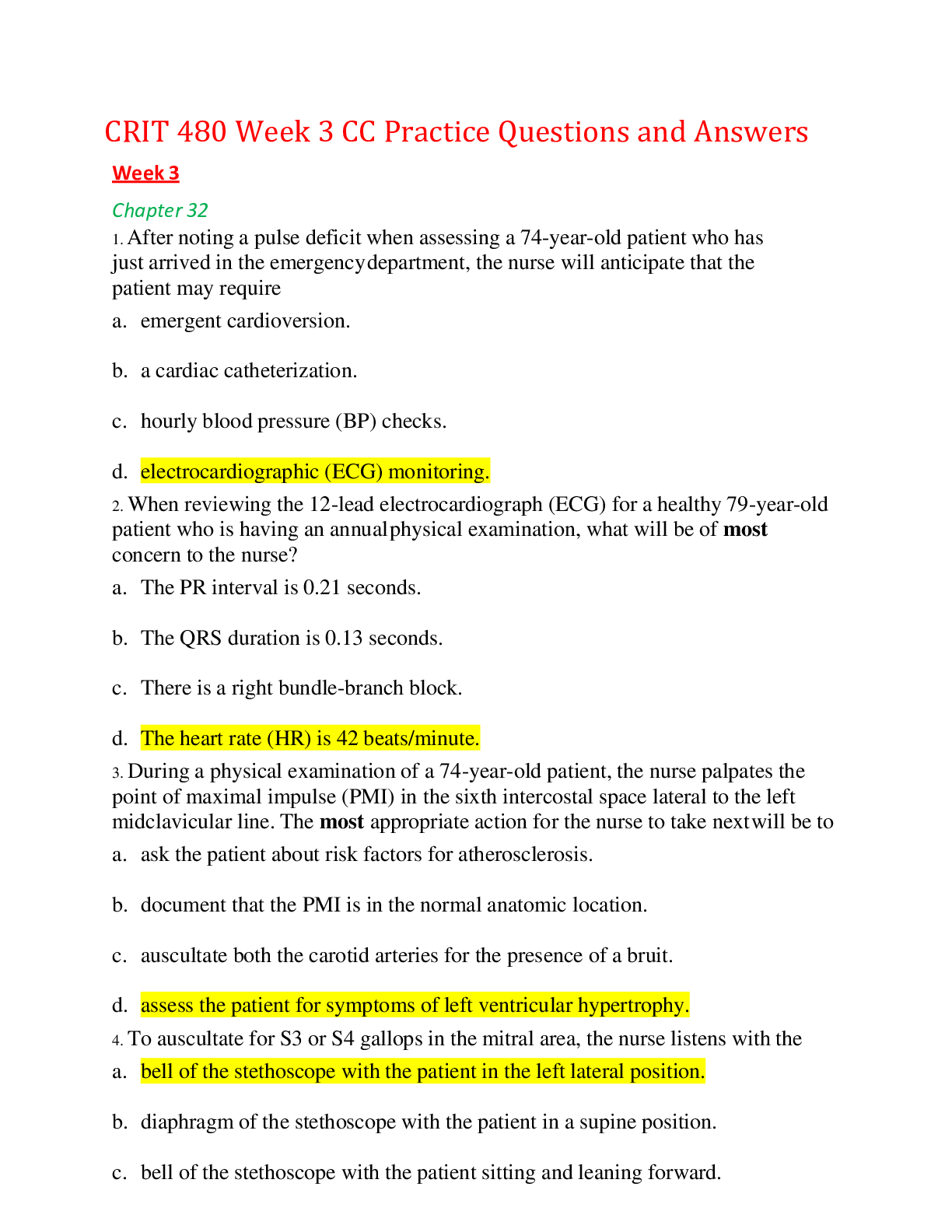 CRIT 480 Week 1-3 Critical Care Practice Questions and Answers BUNDLE (GRADED A+) | (100 out of 100) | Guaranteed pass