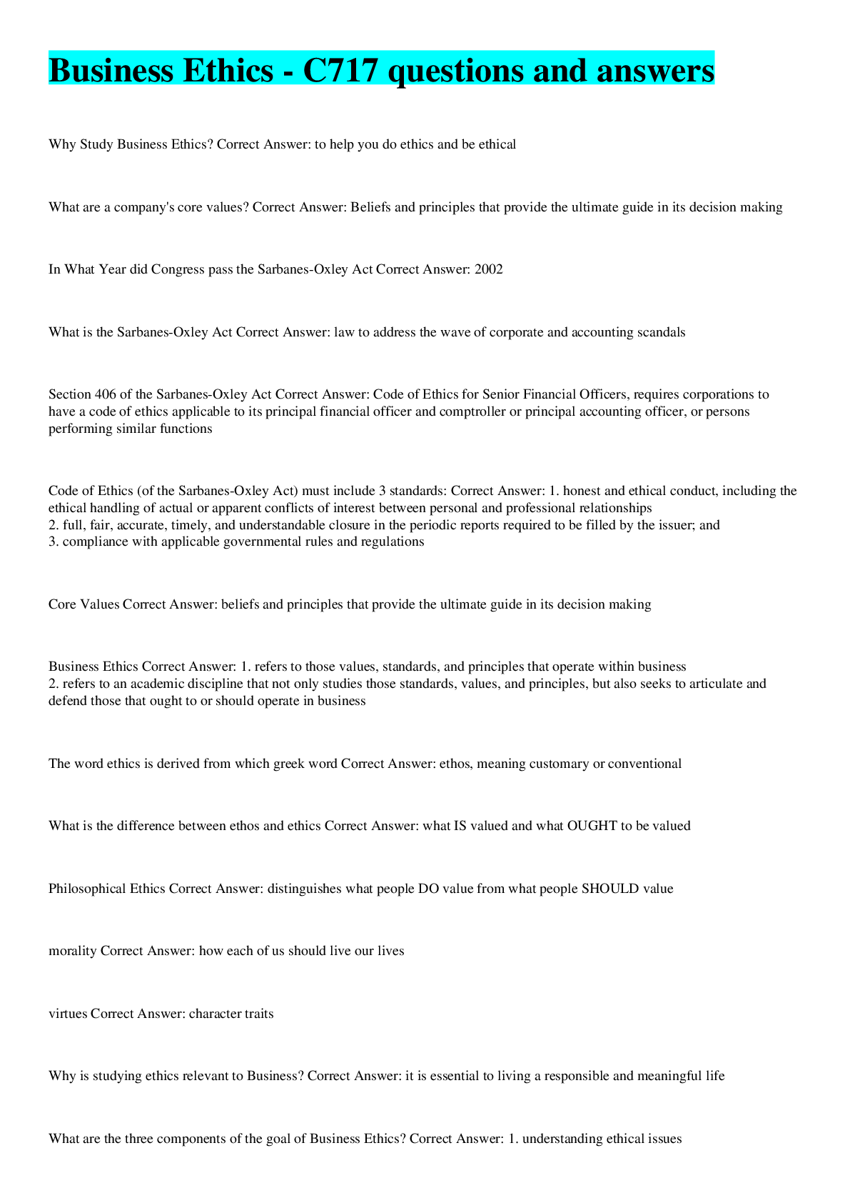 Why Study Business Ethics? Correct Answer: to help you do ethics and be ethical What are a company's core values? Correct Answer: Beliefs and principles that provide the ultimate guide in its de...