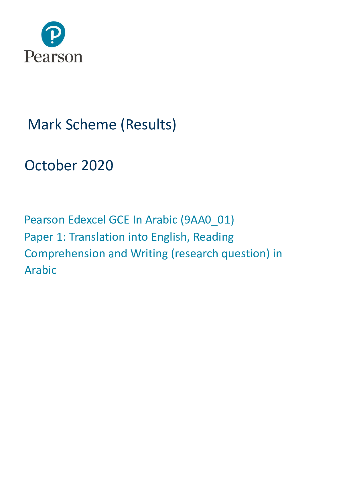 Pearson Edexcel Level 3 GCE/ Arabic PAPER 1, 2 & 3: Translation into English, Reading Comprehension and Writing (research question) and Mark Scheme (Results) in Arabic for 2020