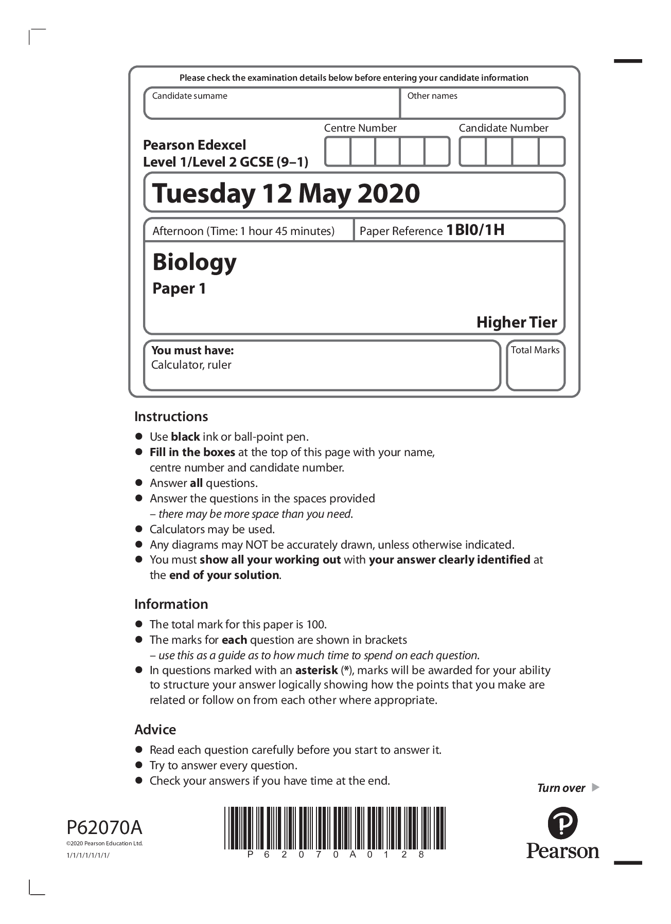 Pearson Edexcel_GCSE (9–1) Biology_1BI0/1H Question Paper 2020 | Paper 1 Pearson Edexcel_GCSE(9-1) Biology_1BI0/1H Mark Scheme 2020 | Paper 1