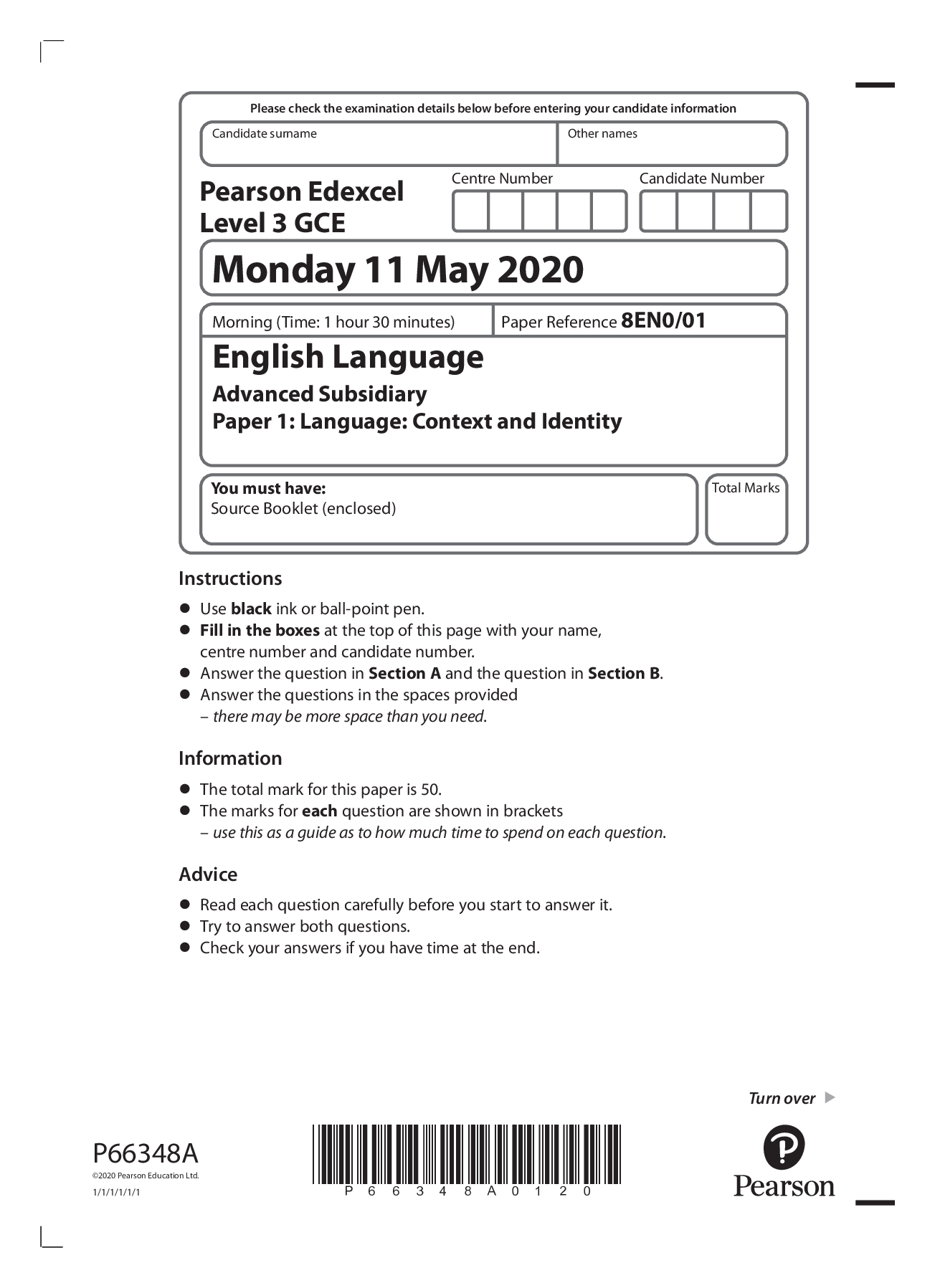 Pearson Edexcel_English Language_8EN0/01 Question Paper_2020 | Paper 1: Language: Context and Identity Pearson Edexcel GCE_English Language_8EN0/01 Mark Scheme_2020 | Paper 1: Language: Context and I...