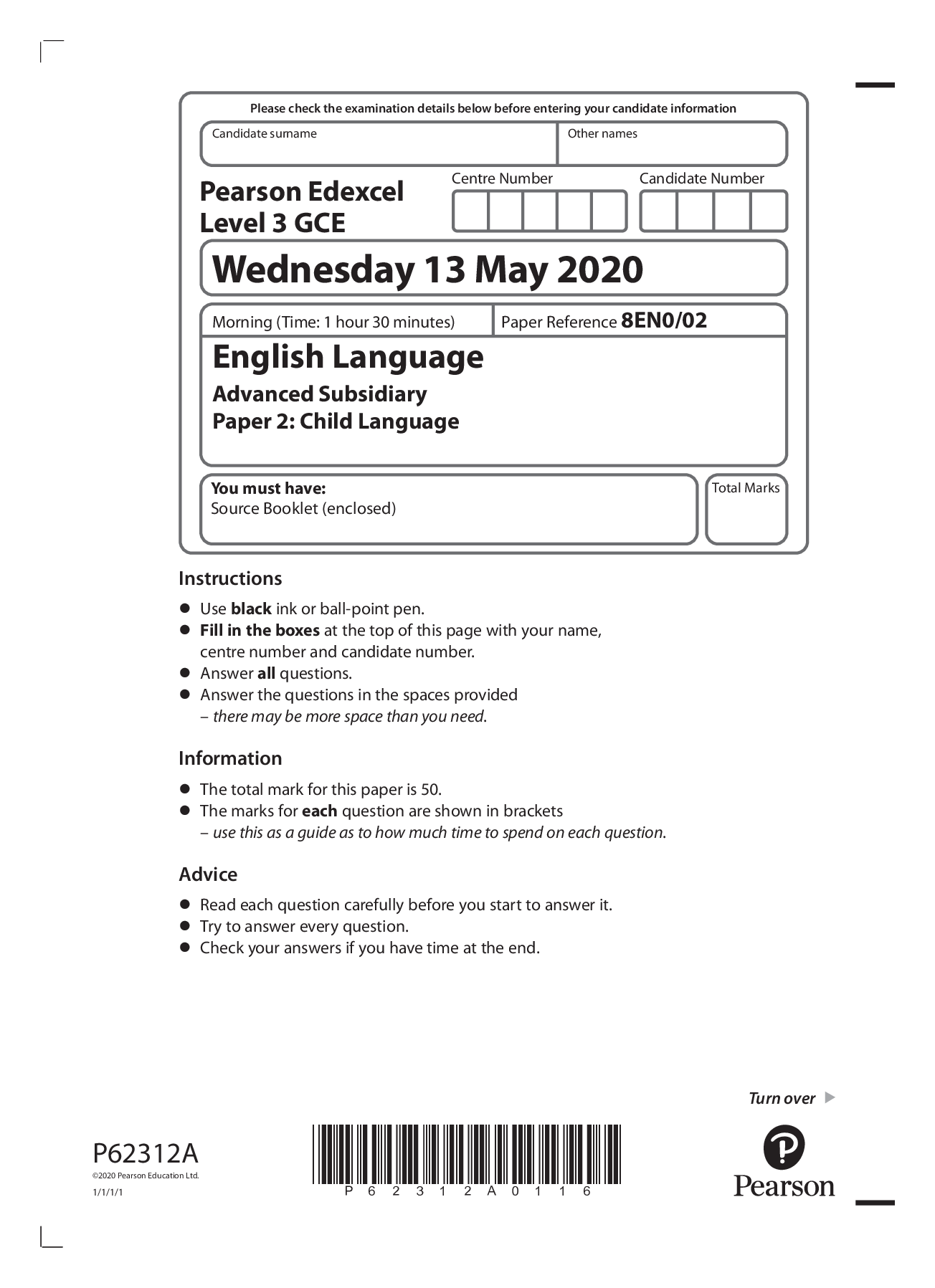 Pearson Edexcel_English Language_8EN0/02 Question Paper_2020 | Paper 2: Child Language Pearson Edexcel GCE_English Language_8EN0/02 Mark Scheme_2020 | Paper 2: Child Language