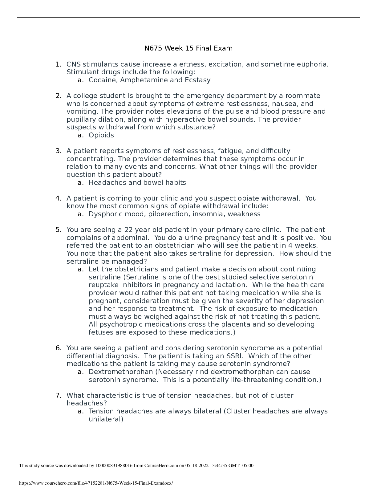 N675 Week 15 Final Exam 2021 Graded A N675L PBL: Obstetrics Answer Key and Tips N675L Week 7 Quiz – Gynecology (GYN) and Sexually Transmitted Infections (STI)(Real quiz graded A) N675L Week 7 – GYN an...